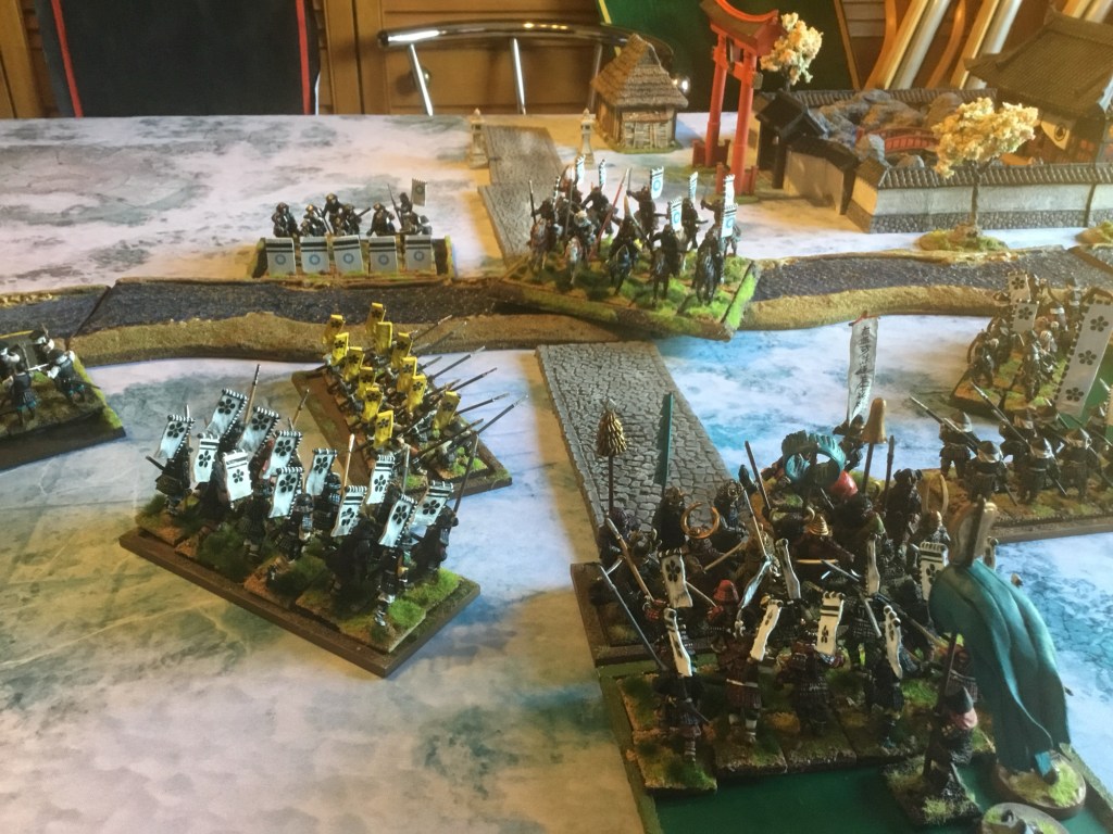 The Kato clan are holding the river crossings. The battlefield across the snowy ground . The river in full flow with just two crossing points. The Kato clan on the left ready to defend. The Maede clan on the right prepare to attack. The Maede clan are ready . The imperial prince is being held safely in meditation in the temple . The battle lines. Read the rest of this entry »