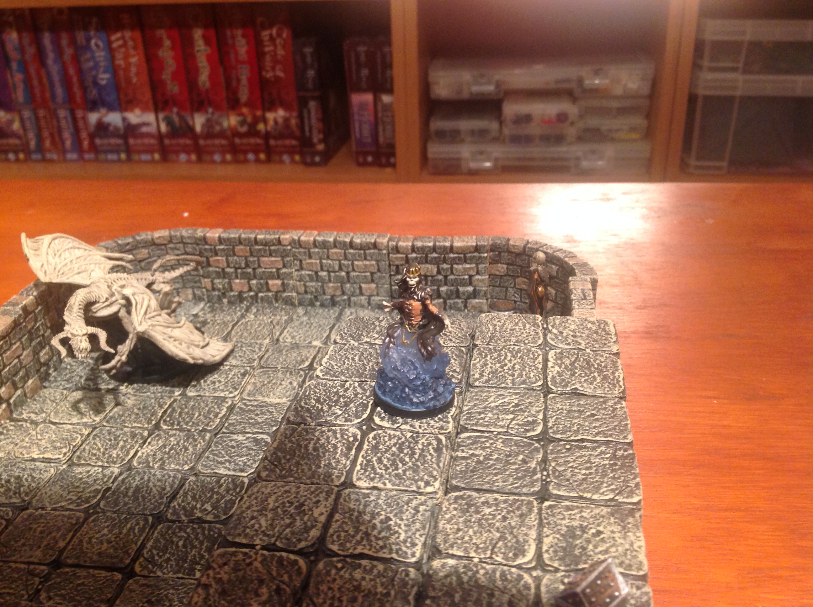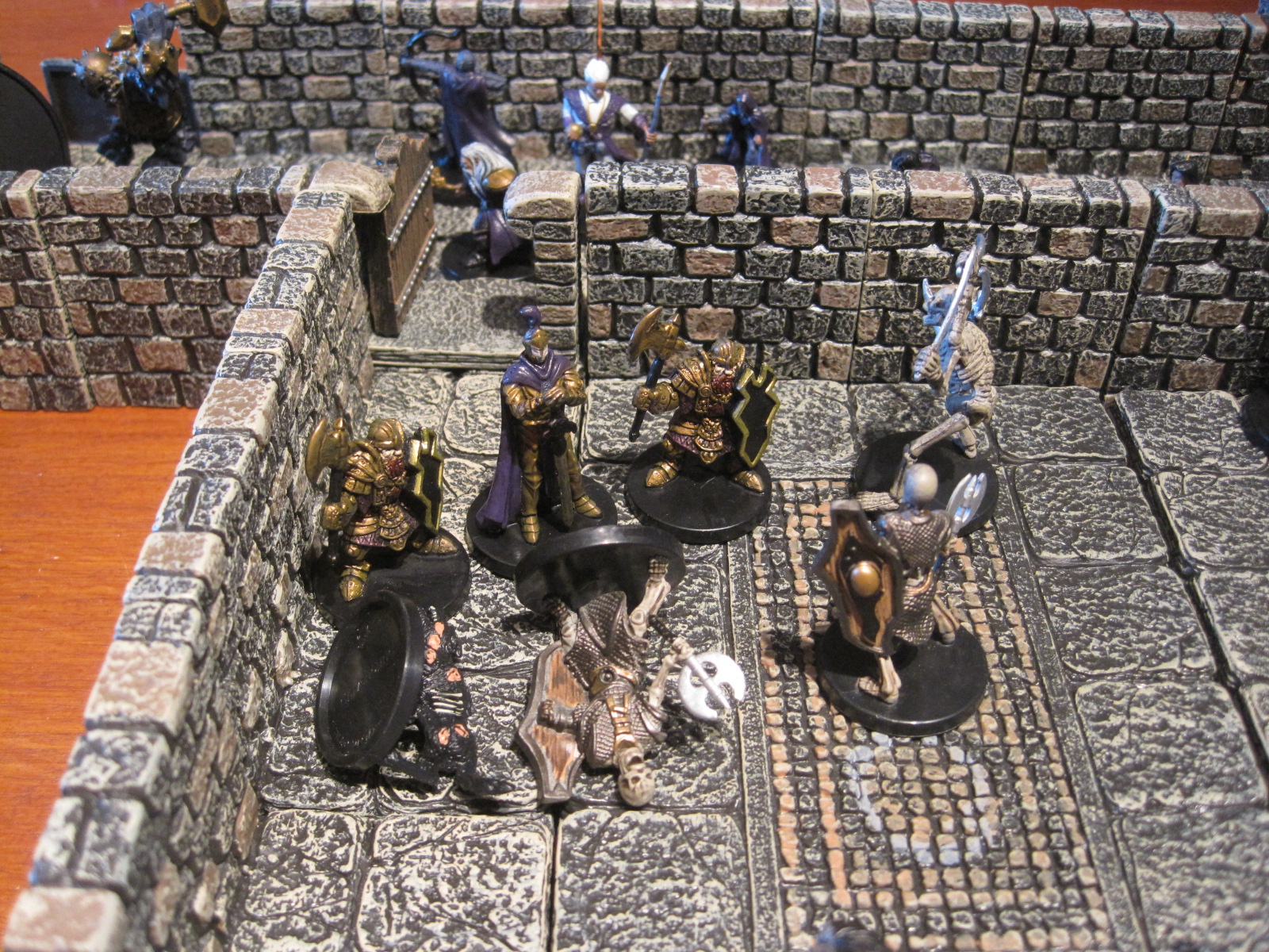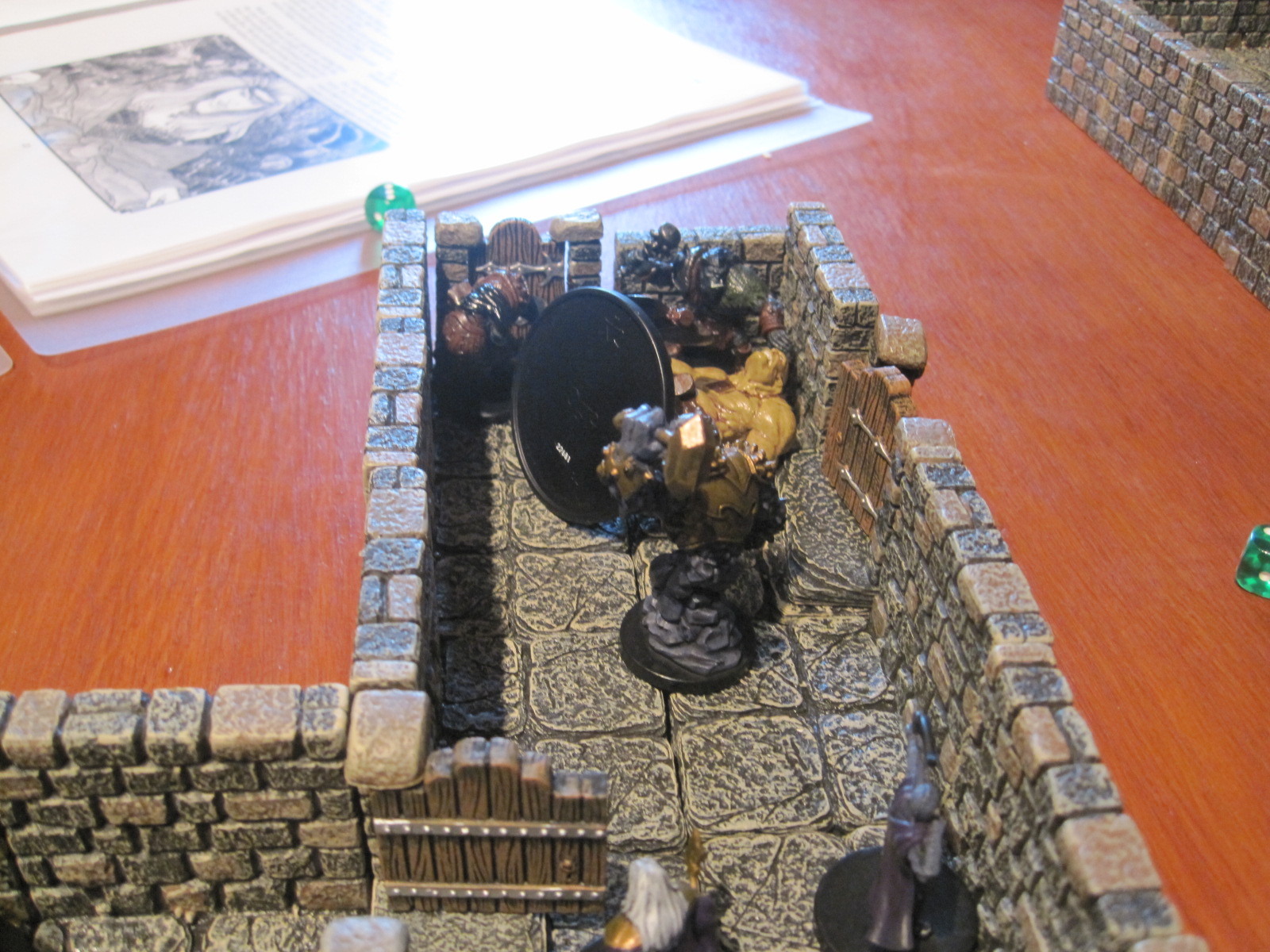 Our heroes bravely rushed into the room, again their archery proving useless against the Undead. The room contained a pile of treasure and the Vampire was wearing a necklace of teleportation should he require it. The Earth Guardian and a Dwarf warrior advanced towards the Ghost and the Vampire whilst the Knight and the Assassin moved round the pool towards the skeleton. The others advanced towards the room as fast as they could but were slower than expected due to the fear emanating from the room (bad rolling on activation).