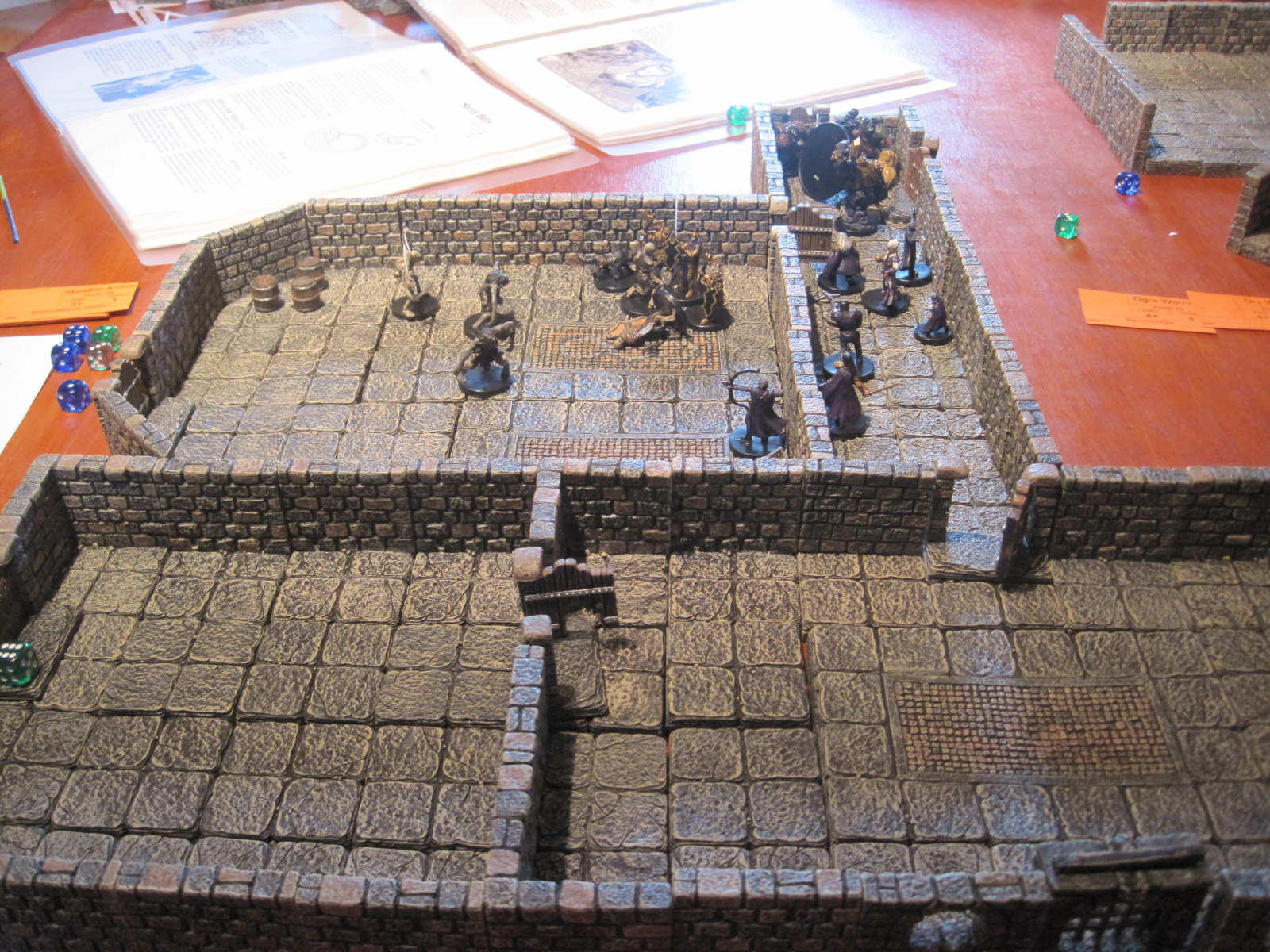 A dwarf warrior forces his way through the first door and rushes into the room. It is filled with undead; a skeleton guardian and some zombies and skeletons. The party advance into the room but find their elven archers relatively useless against the Undead. However whilst half the party is fighting in the room a Gruumsh patrol appears in the corridor to the North; an Ogre with two Orcs. The Earth elemental advances towards the Ogre who ignores the spells and arrows coming towards him. His Orc minions appear dumbfounded. In the room the Dragon Knight and the Dwarven warriors defend themselves against the skeletons whilst an archer attempts to find a useful firing position heading towards the treasure chest.