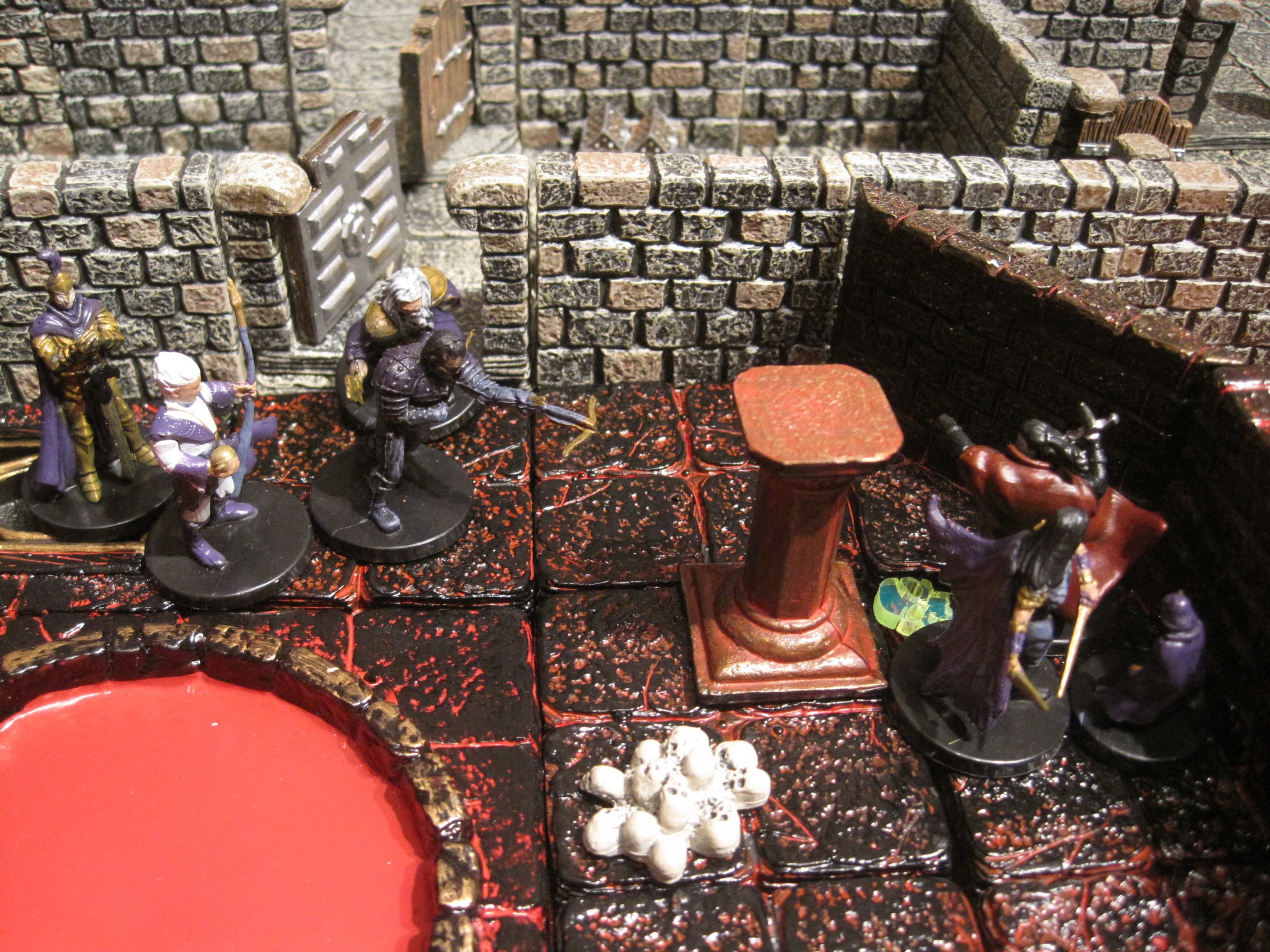 The heroes found an empty corridor with 3 doors and an empty store room. Advancing towards a heavy locked door the Earth Guardian managed to force it open and reveal the Temple of Blood! There was the Vampire with a Ghost and a skeleton archer. A tricky room with a pool, pillars, skulls and a broken grate plus the whole room counted as Vampire soil (which put the heroes at -1 combat). This latter was to prove highly deadly.