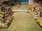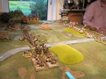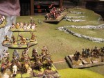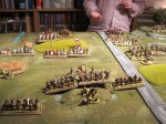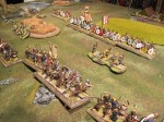Mike’s Romans certainly had the better of the action dice. However they rolled badly when saving against being hit in combat. In the end we decided it was a very close barbarian victory. The Hunnic cavalry advanced rapidly and even charged the Cataphracts deployed to shore up the gap on the Roman left. They charged whilst the Romans had no action die but lost one unit of horse archers who had strayed too close in the process. The Cataphracts however held their ground whilst more huns attempted to encircle them. In the centre both infantry lines eventually clashed with no real winners on either side. Roman cavalry moved towards their left of centre but in this time the Gepid cavalry were eventually moved round to oppose them. The force of the barbarian attack had been blunted across the line as the Romans held but numbers were beginning to tell and the Cataphracts did appear exposed on the Roman left wing.