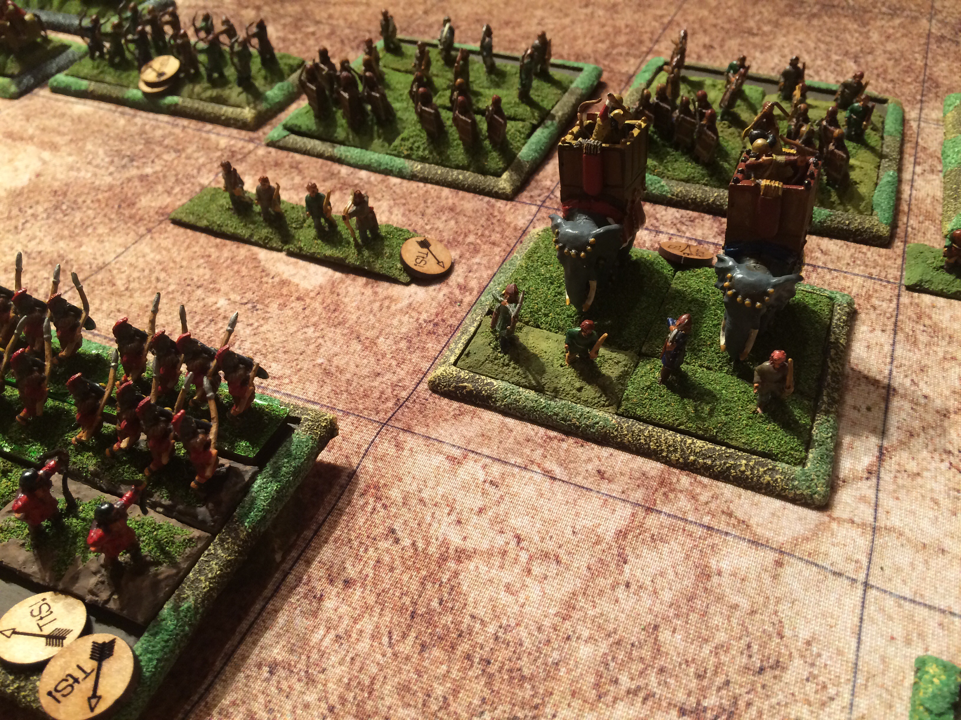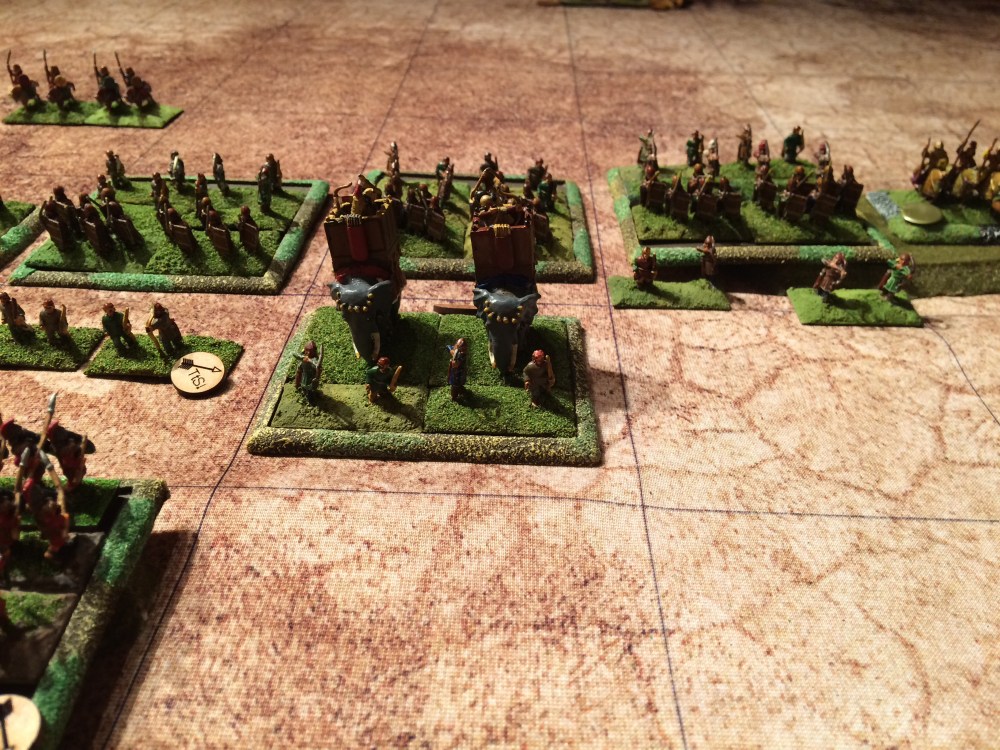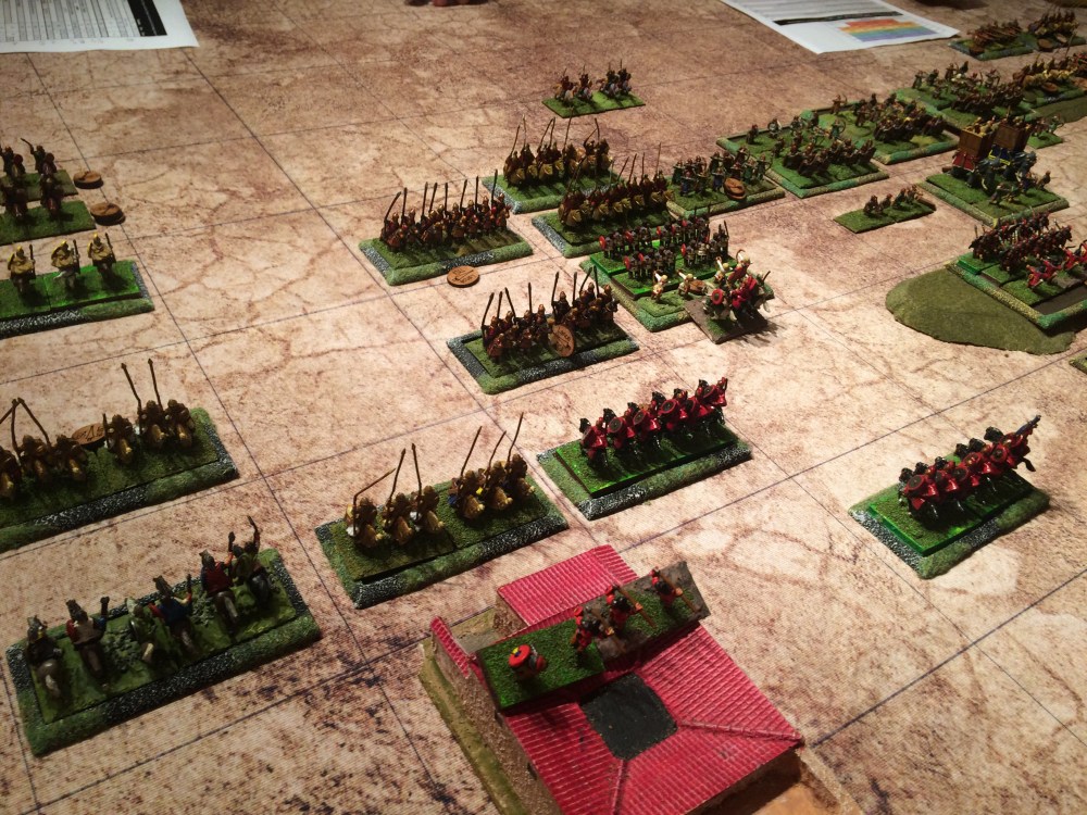 So the romans deployed a mixed force of heavy cavalry and infantry on the left around the villa. In the centre was the infantry and the ballista. On the right was the strong force of heavy cavalry. The Persians placed elephants and deep units of levy in the centre and a holding force of light and heavy cavalry opposite the roman right . They then placed a very strong force of cavalry including cataphracts against the weaker roman left.