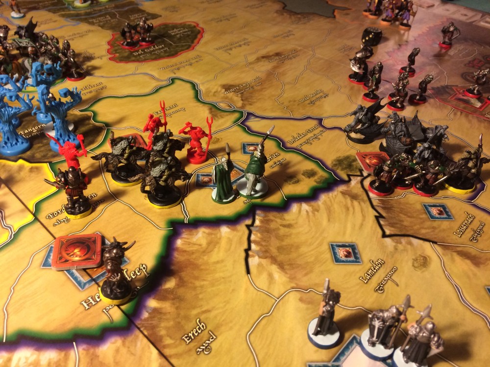 With dol amRoth besieged this would put the evil players on eight vp should it fall. The companions and fellowship were strong with just strider and Legolas away. Lots of cards on the table plus some good blue tiles in play. However there were red cards to balance them and no safe places to heal up corruption nearer than Lorien. Also the party were on about five corruption though both sides had cards to influence this. Thus with the hour late victory was awarded to sauron and Saruman.