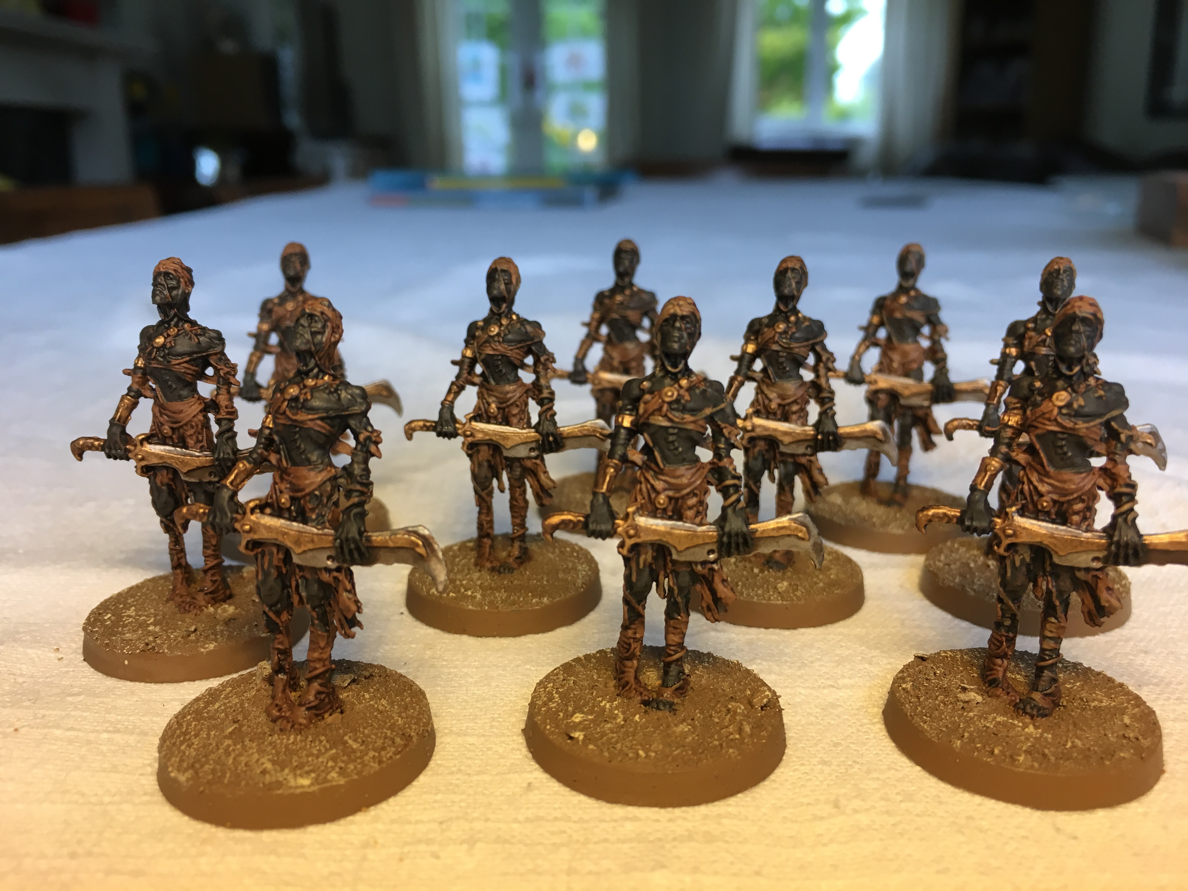Spray paint army painter leather brown. Then add in dark granite for skin areas and gold, bolt metal, bronze mix for decorations. Chain mail for sword blade. Graveyard earth for bringing out correcting any bandages over skin areas. Strong brown wash. Sand mix base. Graveyard earth base. Highlight bone white. Spray varnish Testors dullcote.