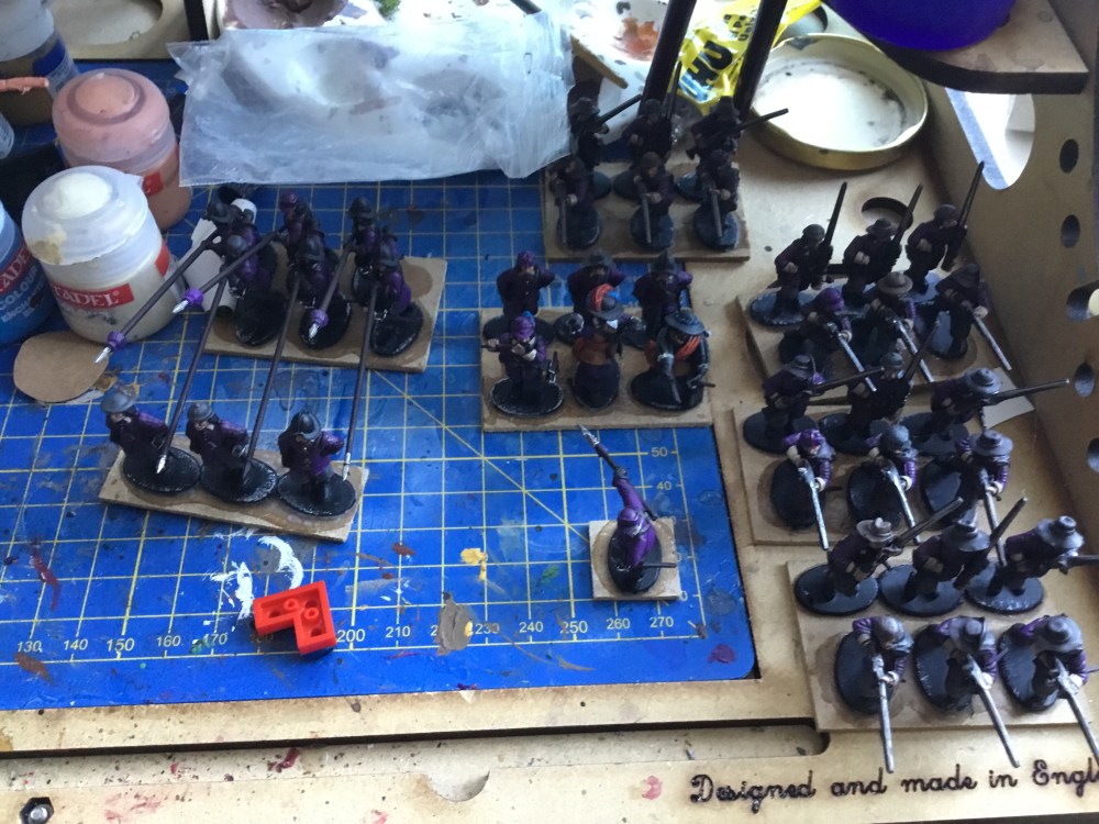 Finally everything gets finished off and highlighted. So a second coat of highlighting using liche purple on the coats. I decided this time not to do a third purple highlight for time which I often do, however this is a regiment and did not seem necessary. Black for the armour. Dwarf flesh for the skin. Various browns for satchels, “apostles” , straps and so on.