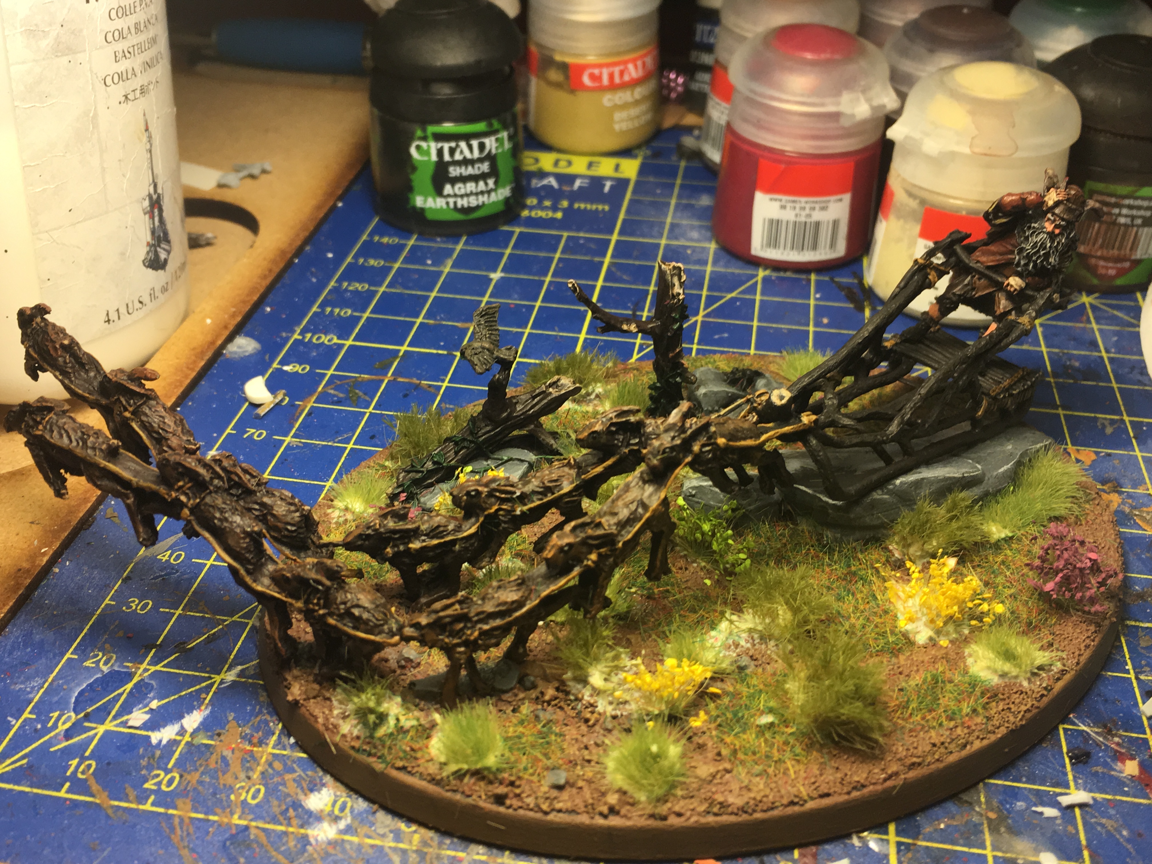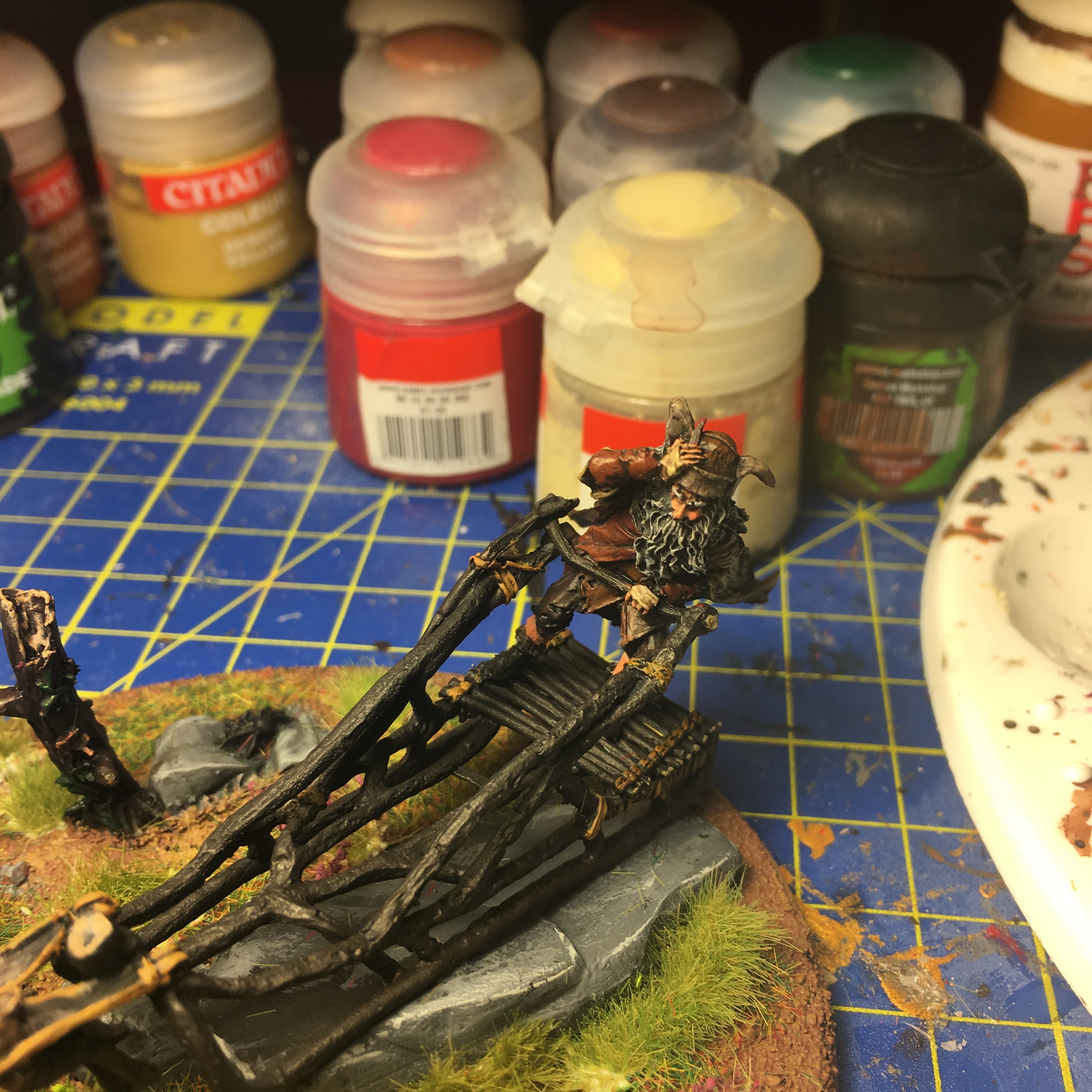 Rhinox hide and black for chariot. Graveyard earth and lighter shade khaki for ends of sticks. Foundry leather brown for ties highlighted with yellow added. Rhinox brown to clothes and rabbit.