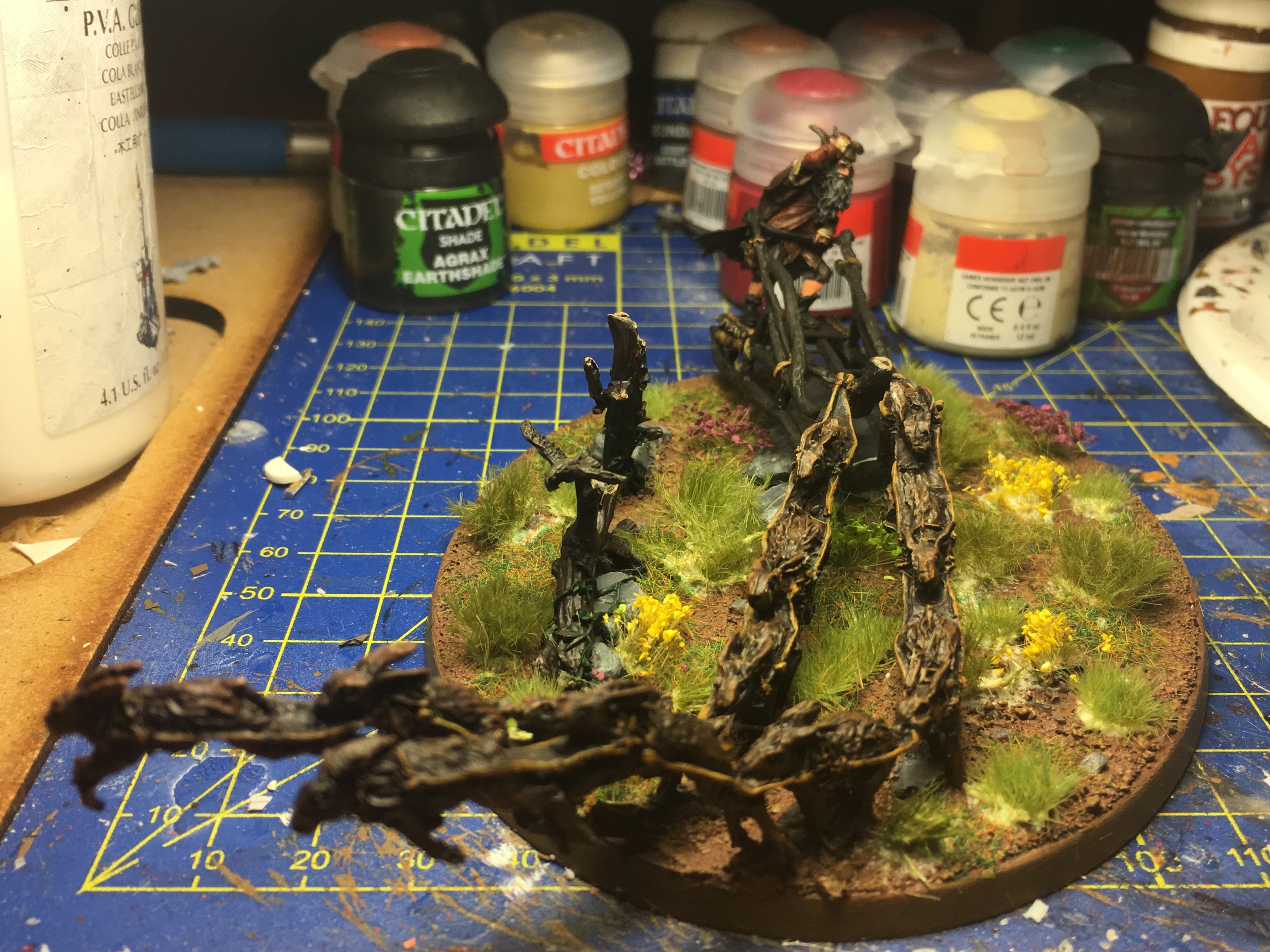 Rabbits get highlight with brown (bestial). Some bleached bone to undersides. Agrax earthshade wash. Black eyes. Re highlight. Leather brown to leather reins.