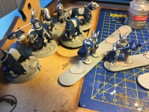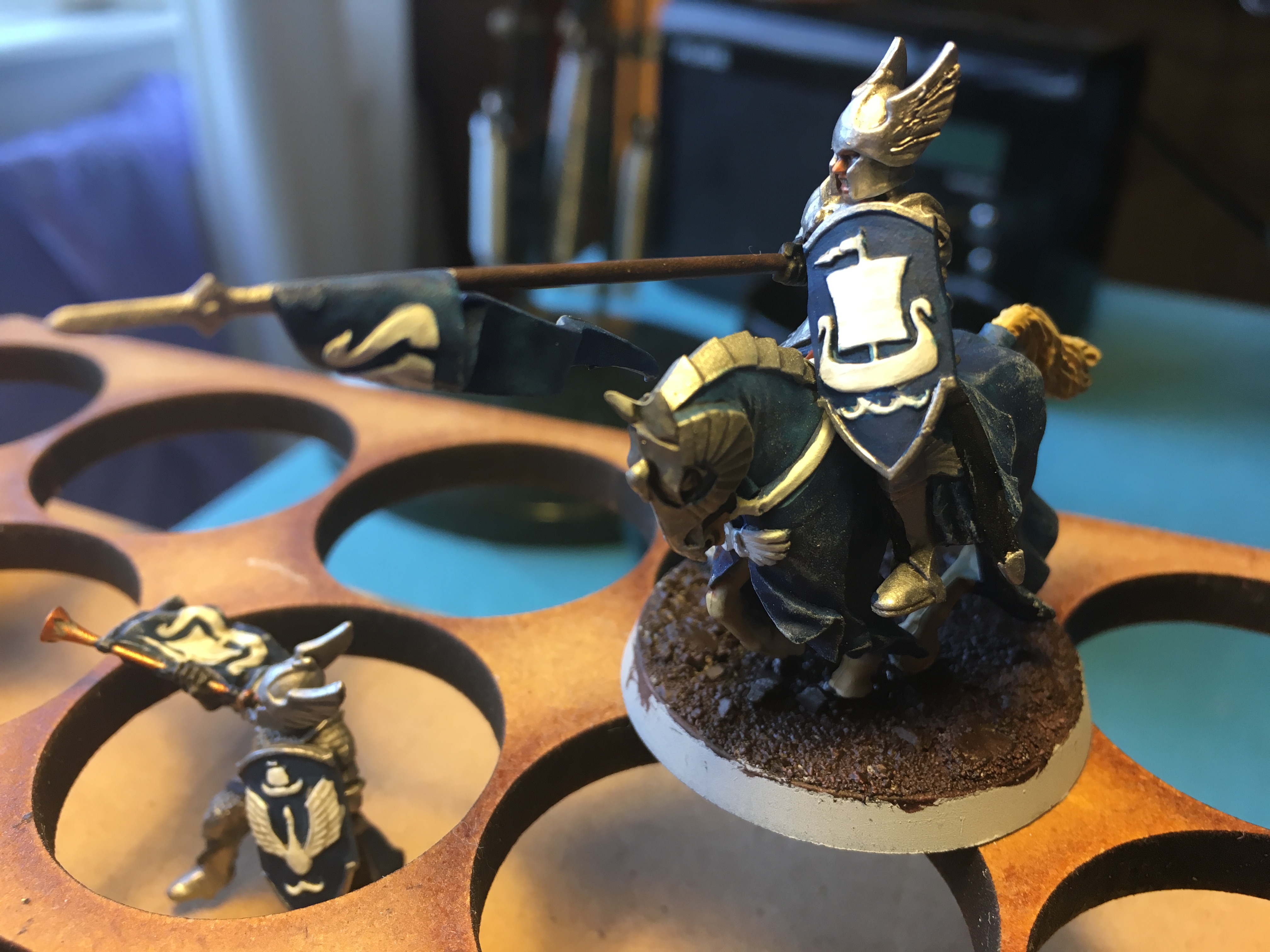 The knights horses have been painted either grey or off white . A blue citadel wash added to all the cloth areas , next a nuln oil wash was added to the other areas such as armour and the white designs on the shields and cloth areas. The leather being painted black first .