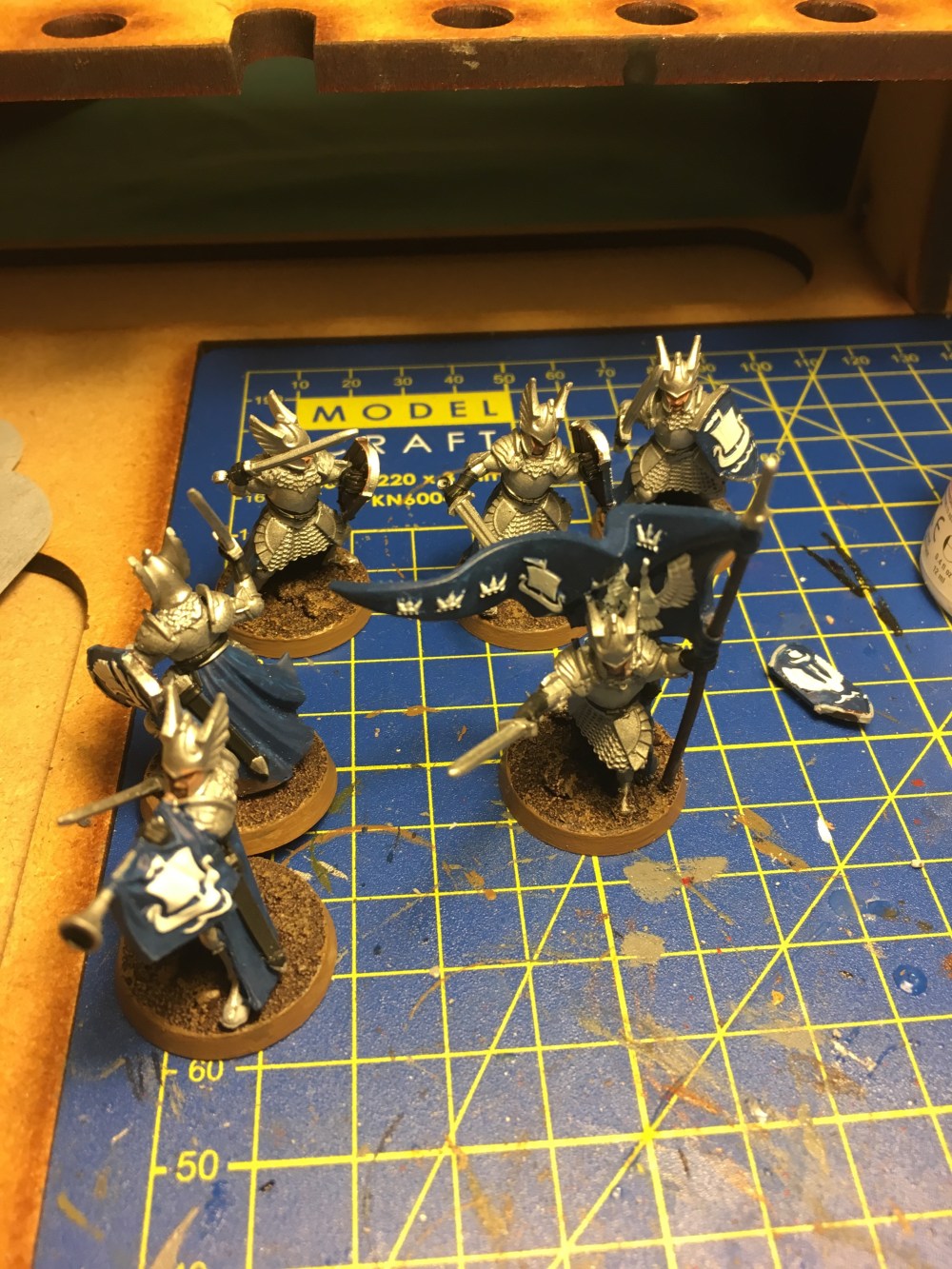 Same technique. Block colour chain mail for armour, black leather, blue cloth. Talaria Flesh base to face. Ashurman blue wash and nuln oil wash. Dark brown to sand then graveyard earth to base and highlight sand.