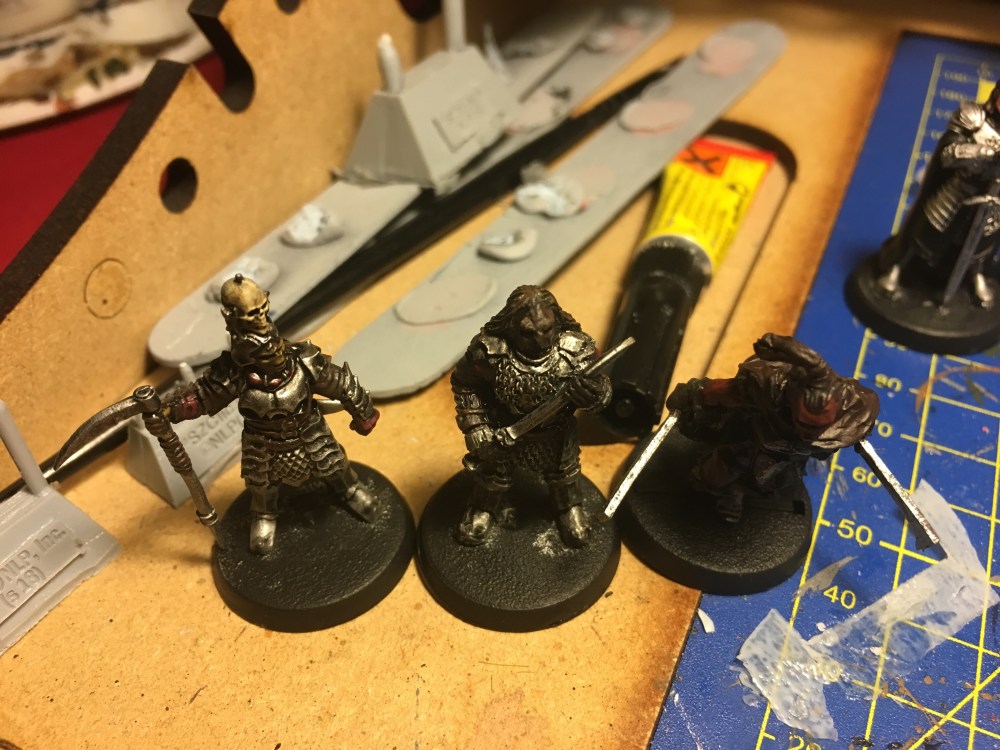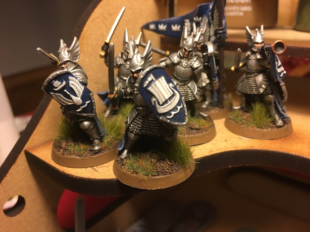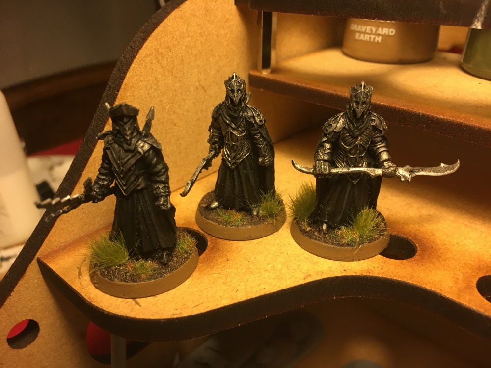 Completed the last three Nazgul and the Foot Knights . Used the same colour scheme and dry brush on the blue as the mounted versions . Have also painted the foot and mounted version of Thranduil using the games Workshop colour scheme . The weapons are very fragile but I was able to drill holes on the hands and carve a pin into the broken swords and re affix them .