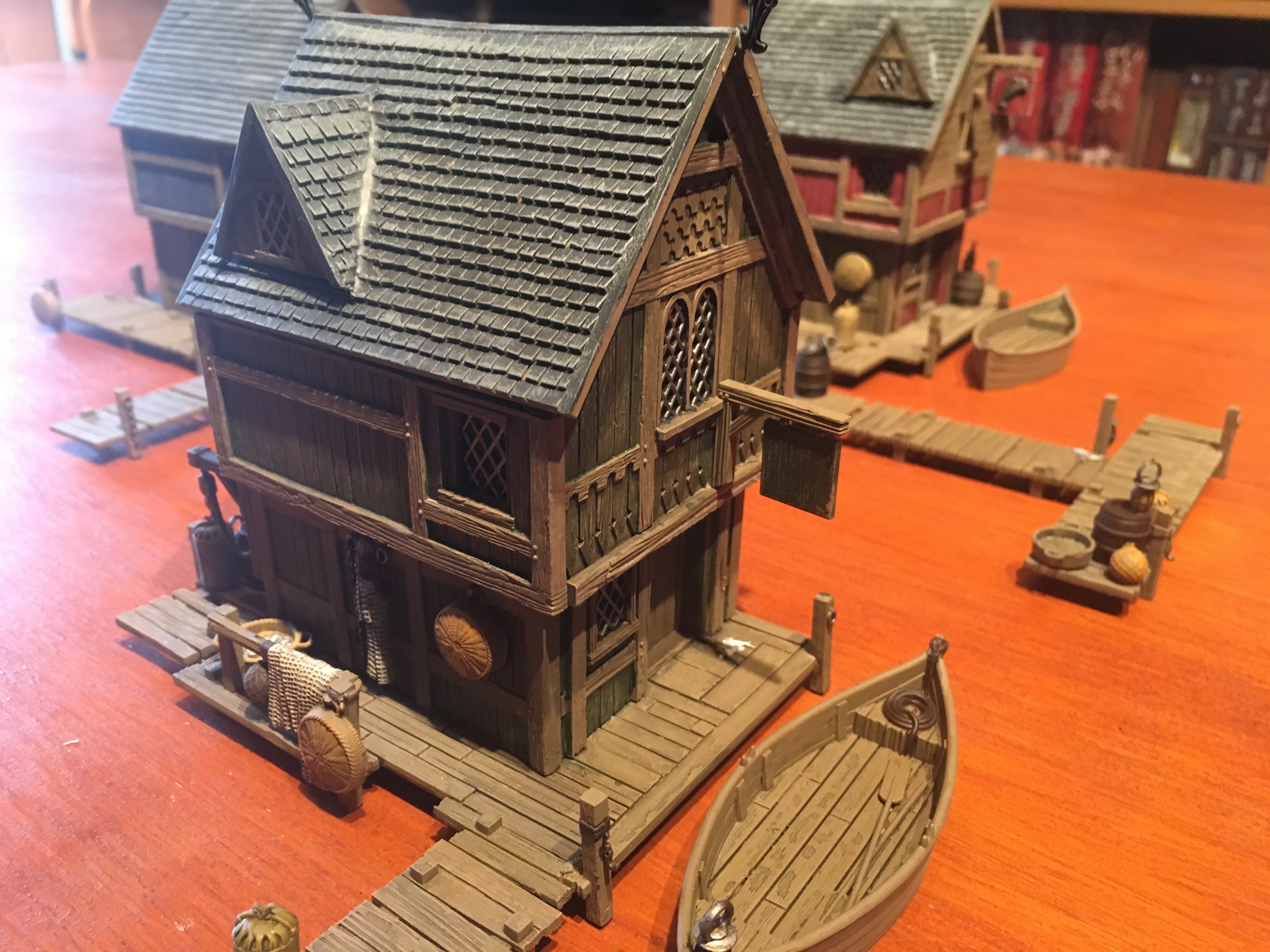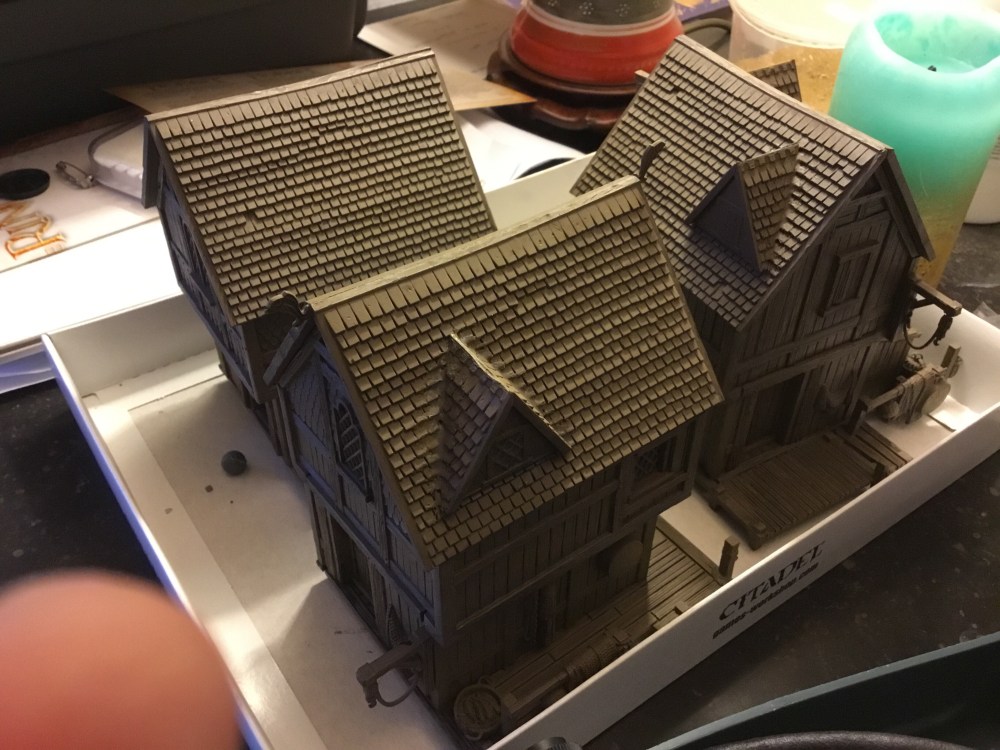 Base colour brown then an army painter dark tone watered down wash then highlighted and gaps covered in brown. Used putty to fill gaps. Each house was done to be unique following a slightly different design or adding an outhouse. Some more stages to follow of course.