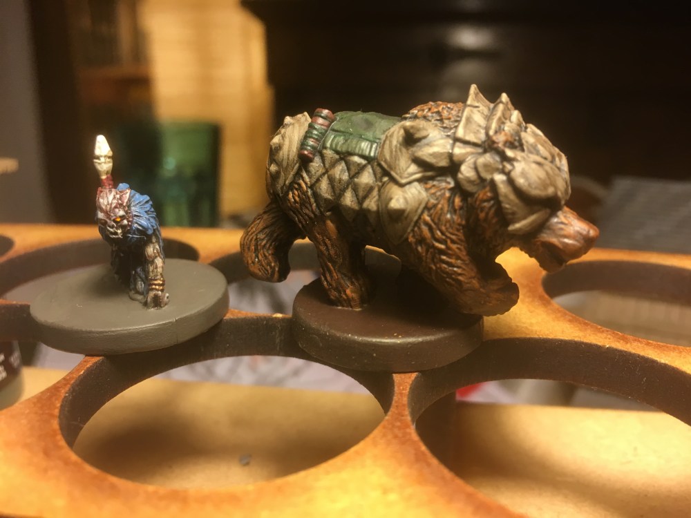 Layers of dark brown all over then bestial then vermin brown to fur. A lighter brown to the wood armour. Dark green highlighted with catachan green to the saddle cloth.