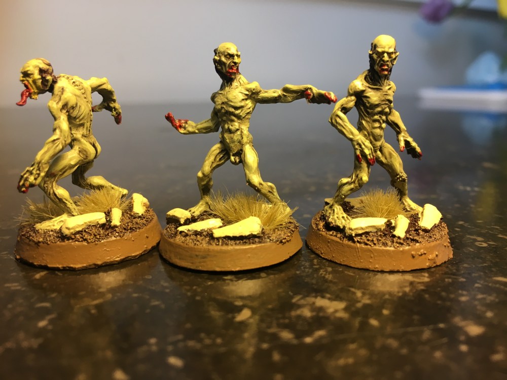 Necrotic Flesh Spray undercoat and paint. Strong Tone or Dark Tone (Ghouls) Wash. Skull white bones. Highlighted necrotic flesh. A few touches of Bubonic Brown to Greater Zombie. Blood for Blood God to the Ghouls to break up the colours and show them as having been digging up corpses, scattering and breaking bones to get at the marrow perhaps. Paler Tufts.
