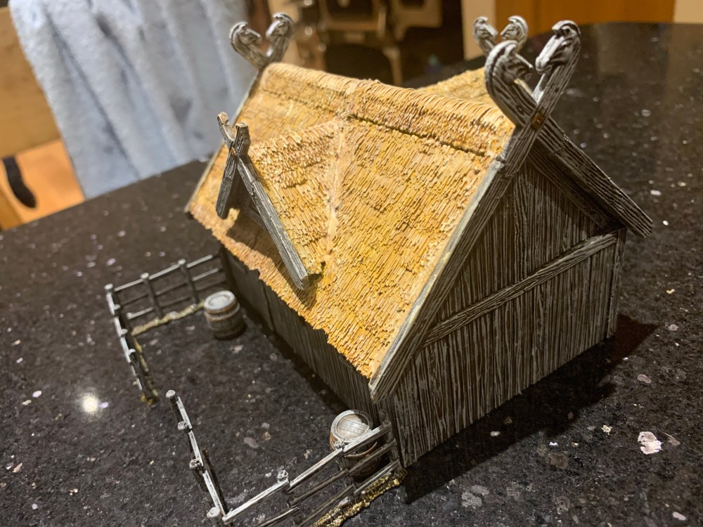 Model sprayed with new citadel grey. Because of the white putty it was not really possible to do the roof using citadel contrast so this was painted yellow, then washed with sepia brown then dry brushed with yellow and bone and then bone.