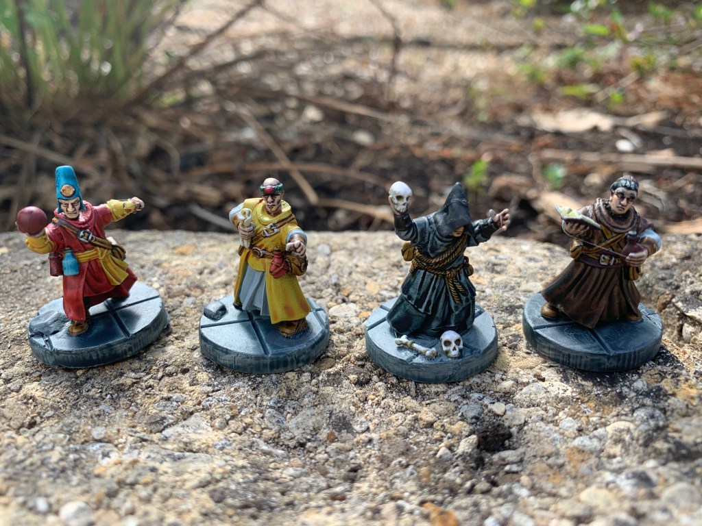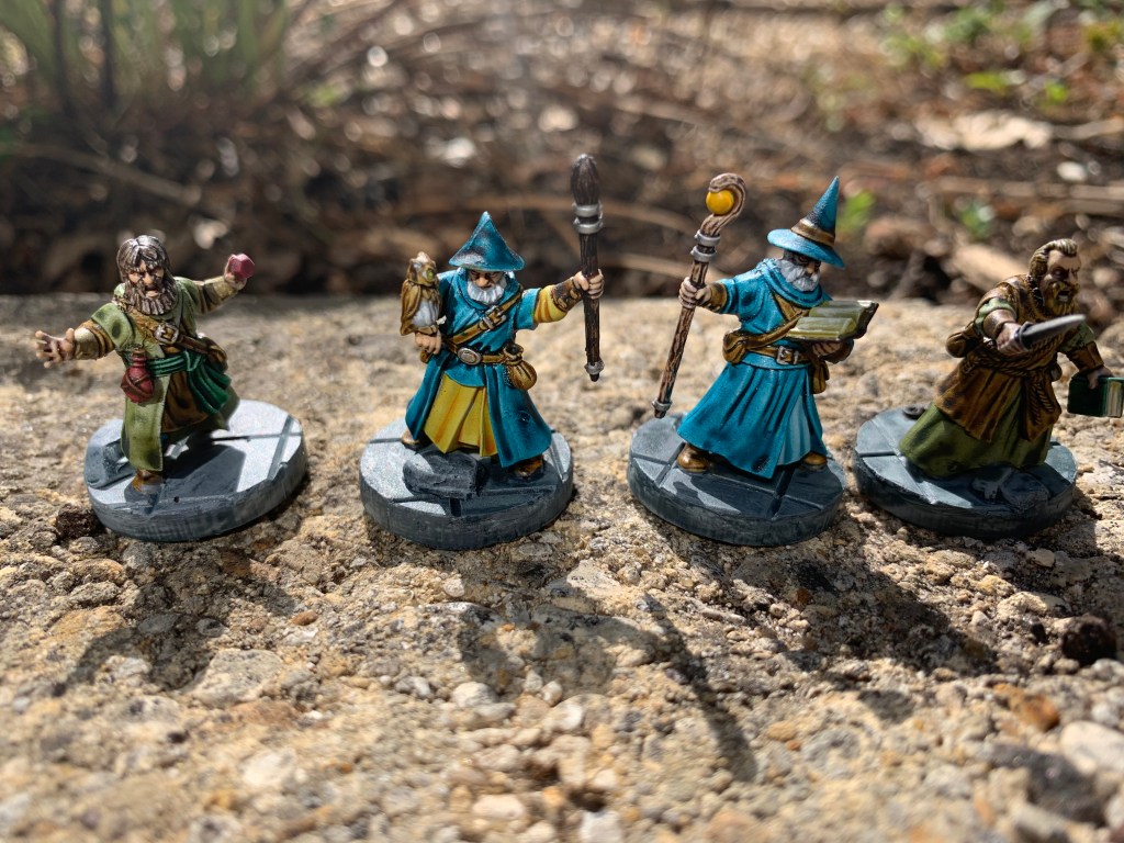 Cut off from stands and glued on resin bases. Spray with grey primer (run out of GW primer). Contrast paints applied in a single coat. Hardly any highlighting except white on beards and a little for scrolls and paper. I mix the grey and yellow contast paints then highlight with cream citadel paint. Wraith bone and white to highlight the skull. Chainmail to the metal.