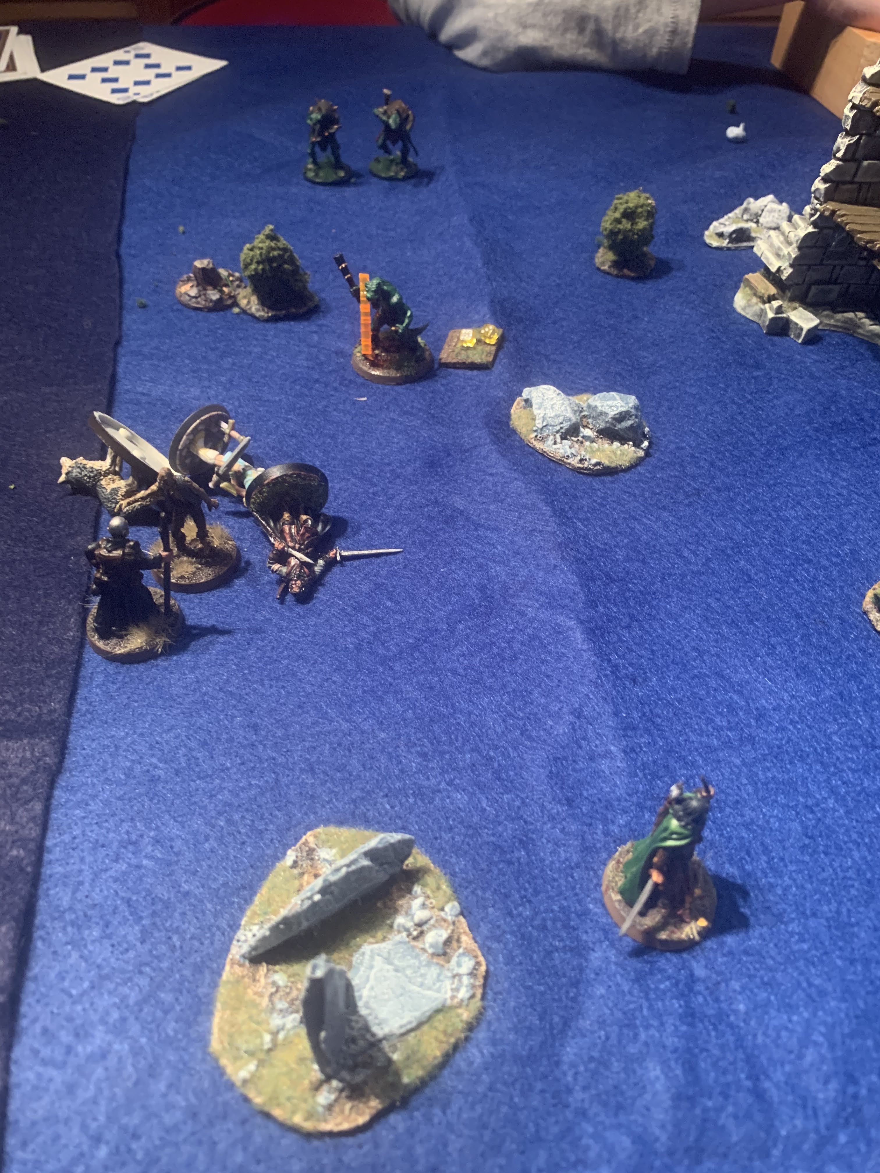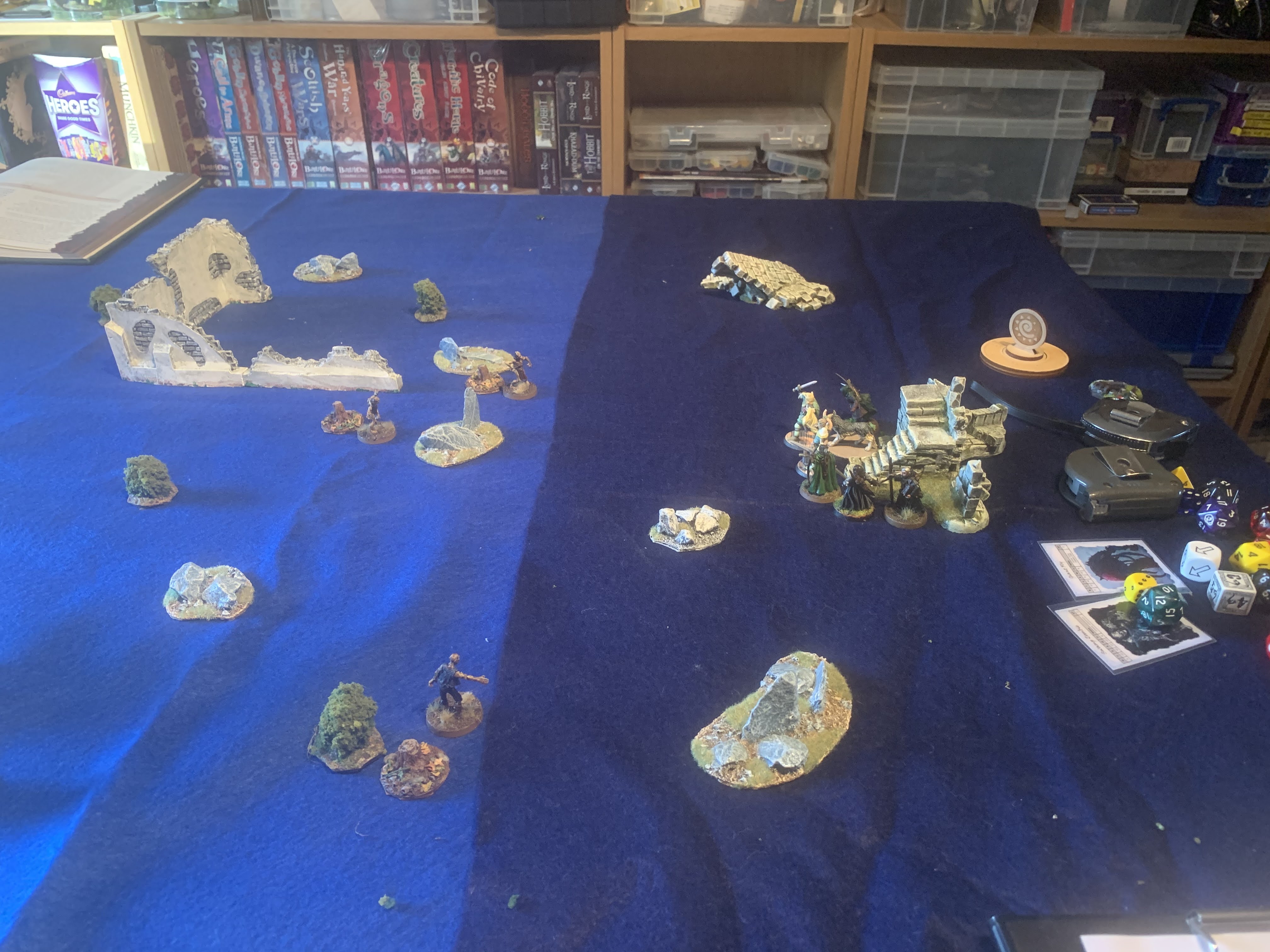 Dark Tom is badly wounded but just survives thanks to his staff. Steel Blaze the Swordsman rushes to his aid but once again is knocked out. Just then a Group of Lizardmen appear. Two archers and a warrior! The archers are clearly deadly shots and with their movement impeded by the flood the heroes struggle to close the distance. Gwalchmai finds and deciphers some arcane runes, learning a new spell for the heroes to choose in a future scenario. Heavy rain falls and offers some respite reducing visibility and the effectiveness of ranged shots.