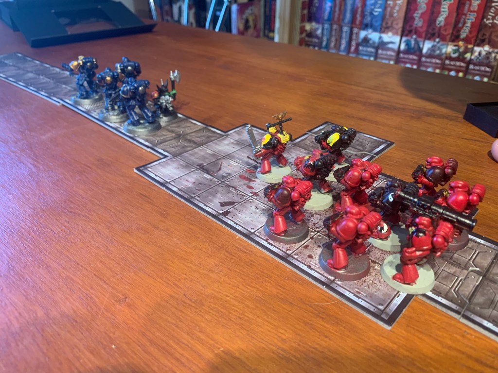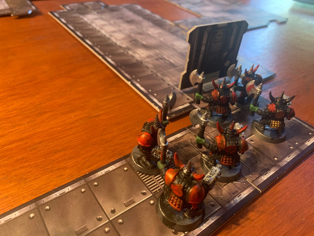 In our scenario the marines are responding to a rescue beacon on an old hulk lost in space. They find some orks attempting to break in the first door and drive them off.
