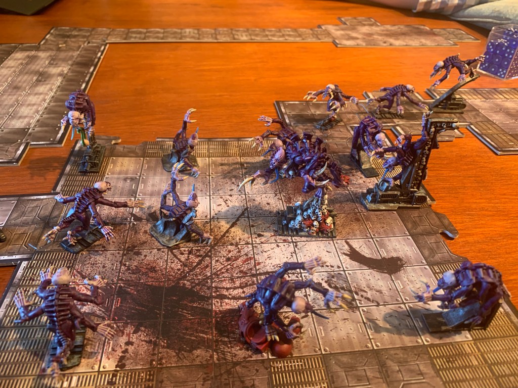 Next they open the door by hacking the terminal. They find gene stealers have made a nest and taken out a previous patrol.