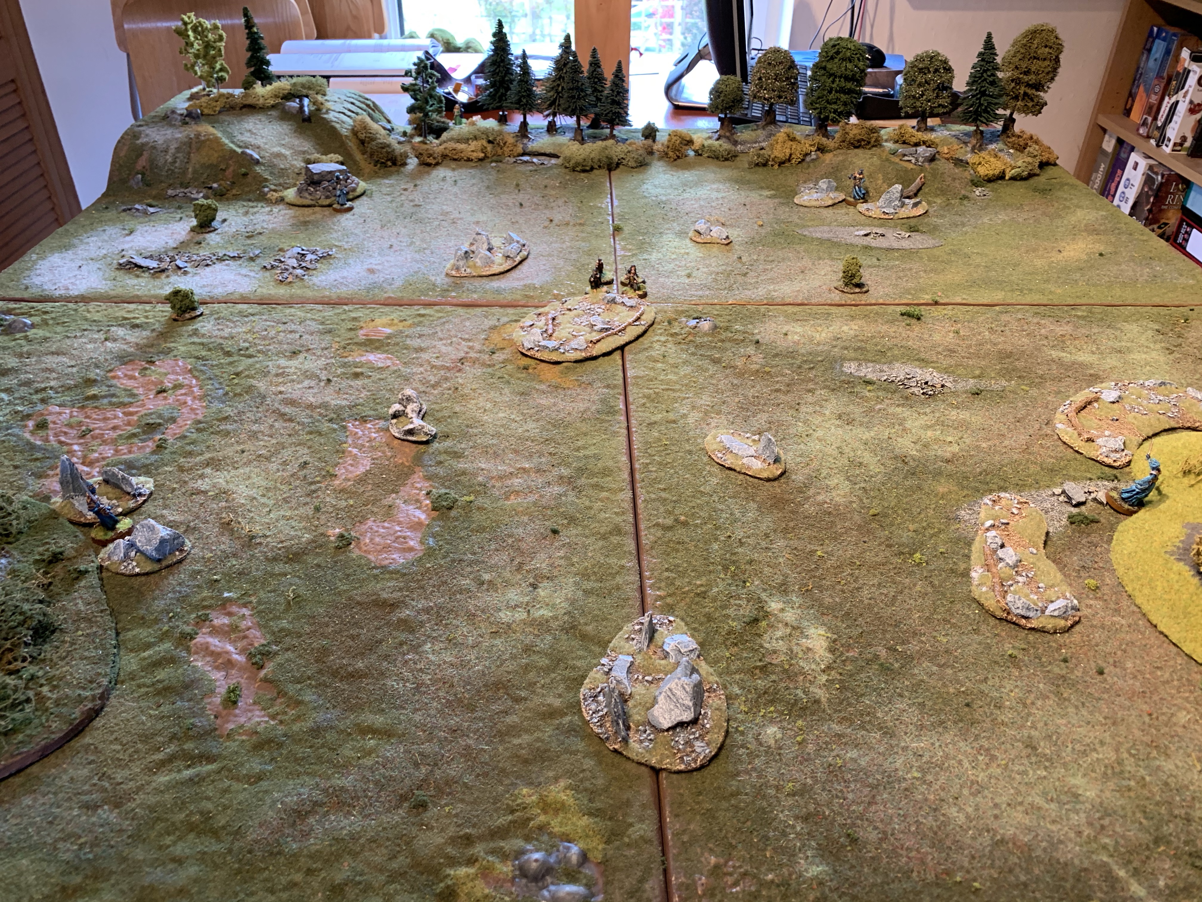 The Hobbits began in the centre whilst the Nazgul chose to split up- one to the North, One in the centre and one to the South. The sentries all randomly moved in the wrong directions except the Northern one who did not move the first 3 turns.