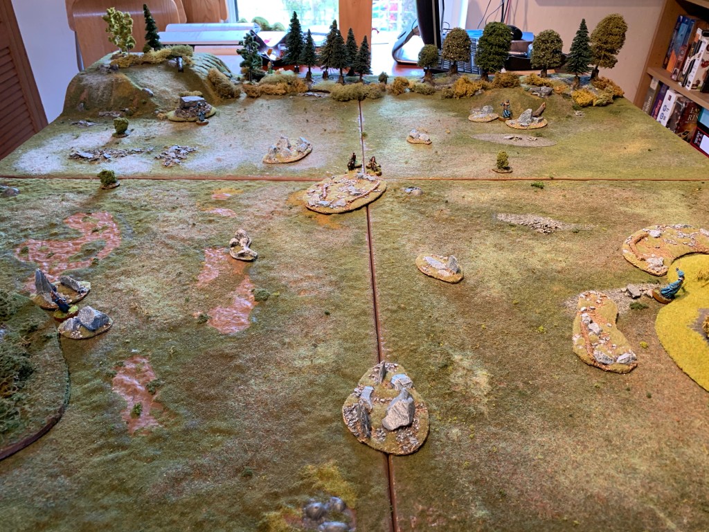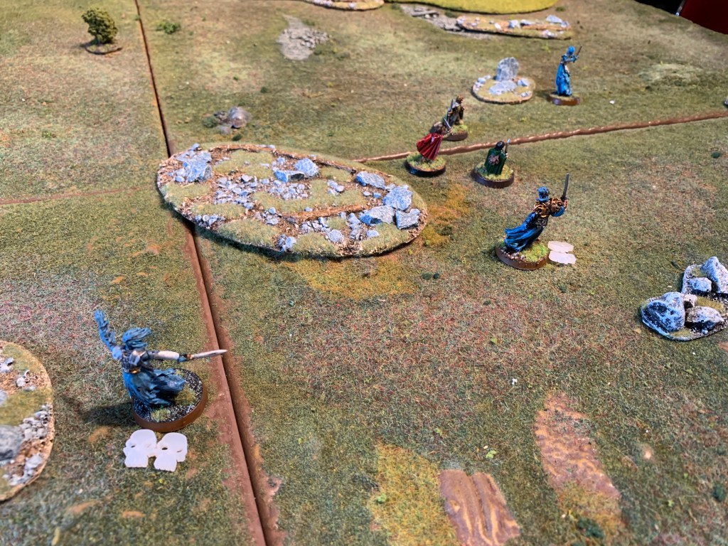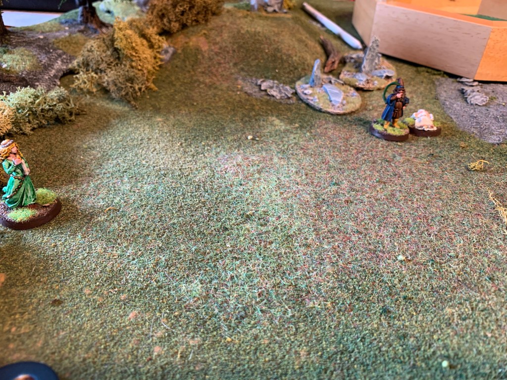 The Hobbits where able therefore to carefully thread their way along the centre path sticking to cover and evade the sentries till they reached the edge of the woods. They could see Ferry waiting across the open ground. However at that point the Northern sentry (rolled a 6) and finally moved towards pippin and was able to raise the alarm- alerting all the others. Middle and Northern sentry converged towards the hobbits. They cast Transfix successfully on Frodo! Then they had initiative and were about to pounce when Good called a Heroic Move and evading their grasp! They cast Black Bolts on Frodo and wounded him twice. He used all his fate and was down to his last wound.