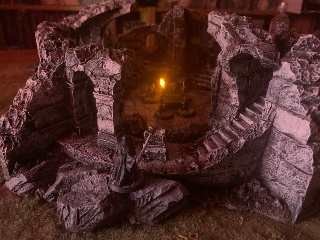 Leaving strict instructions to the Hobbits not to light a fire Aragorn has left the halflings hiding in the ancient hilltop ruin Weathertop.