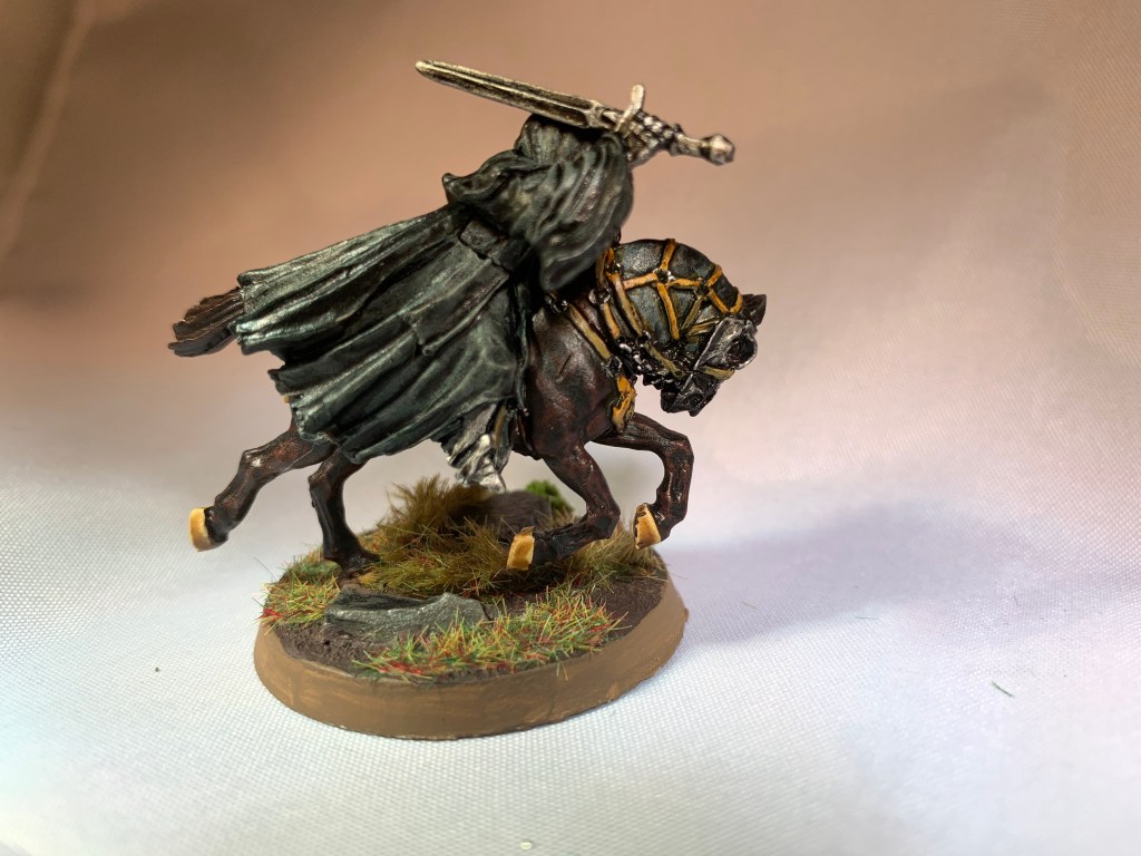 Painted my 7th Nazgul on a horse. Hopefully this should be enough for the next scenario. painted with contrast paints almost exclusively. Black Templar for the cloak, cyborg brown for the horse. Chain mail for the armour and then the new nuln oil gloss applied. Snake bite leather for straps and agarose dunes for hooves.
