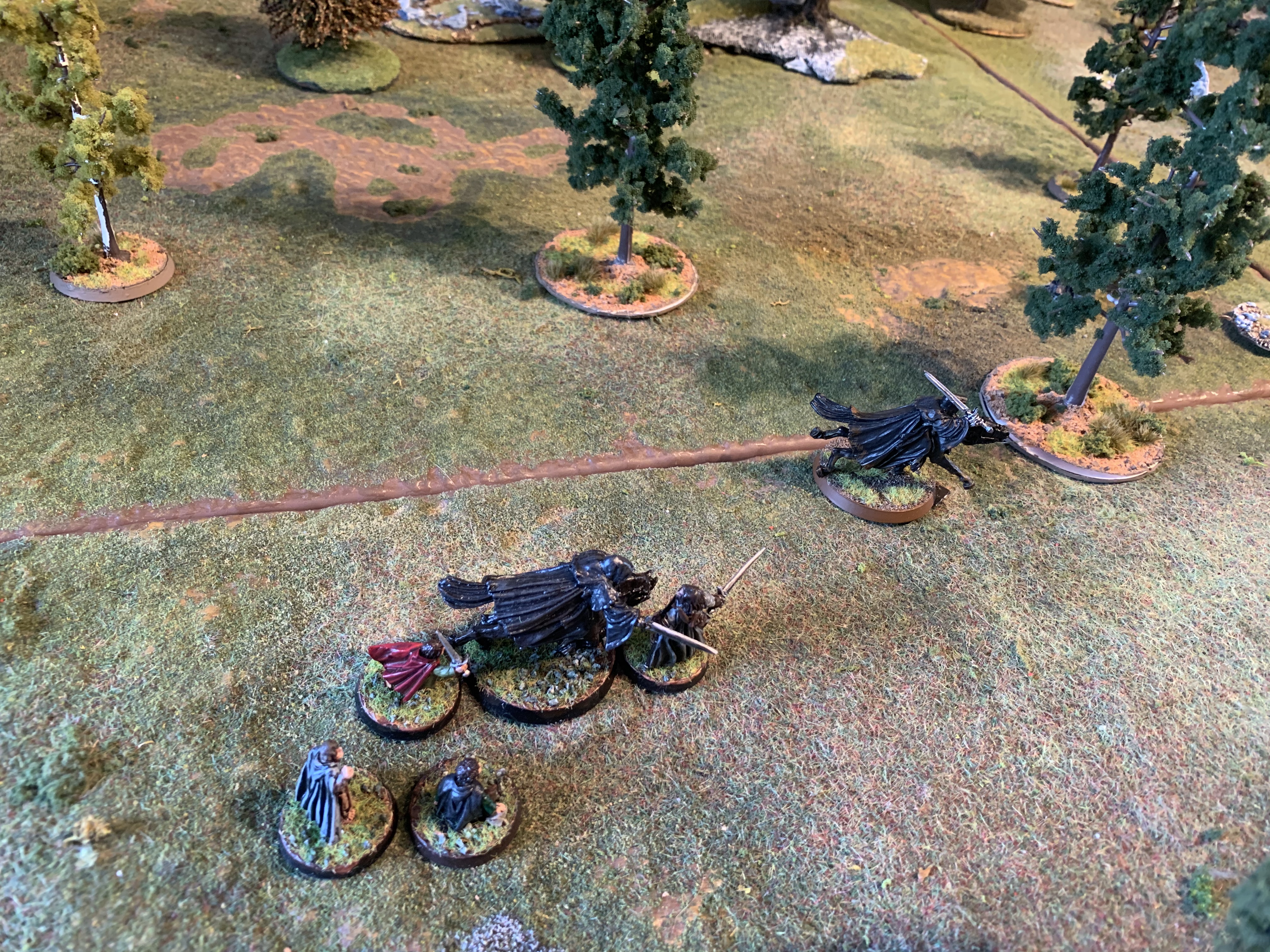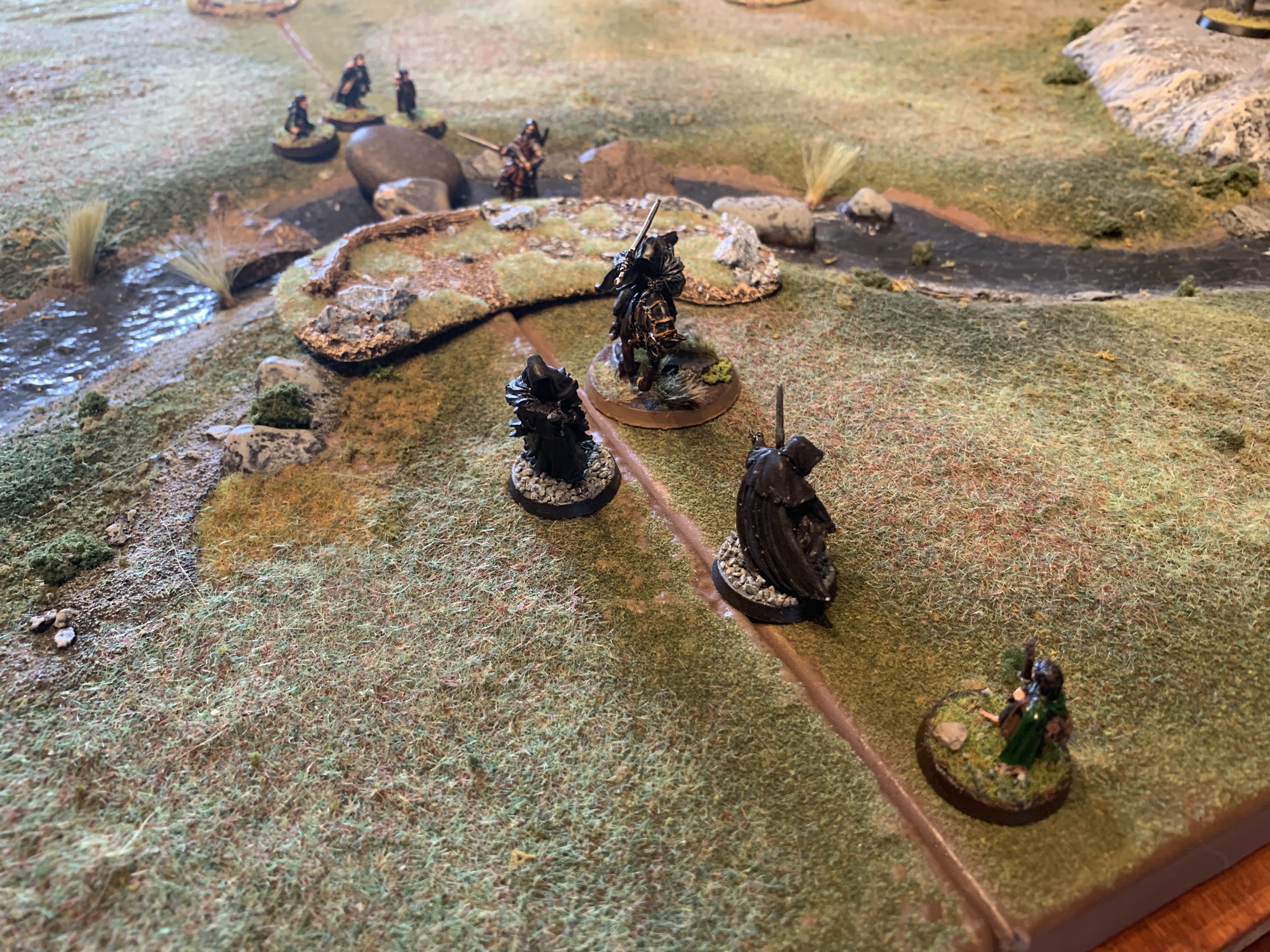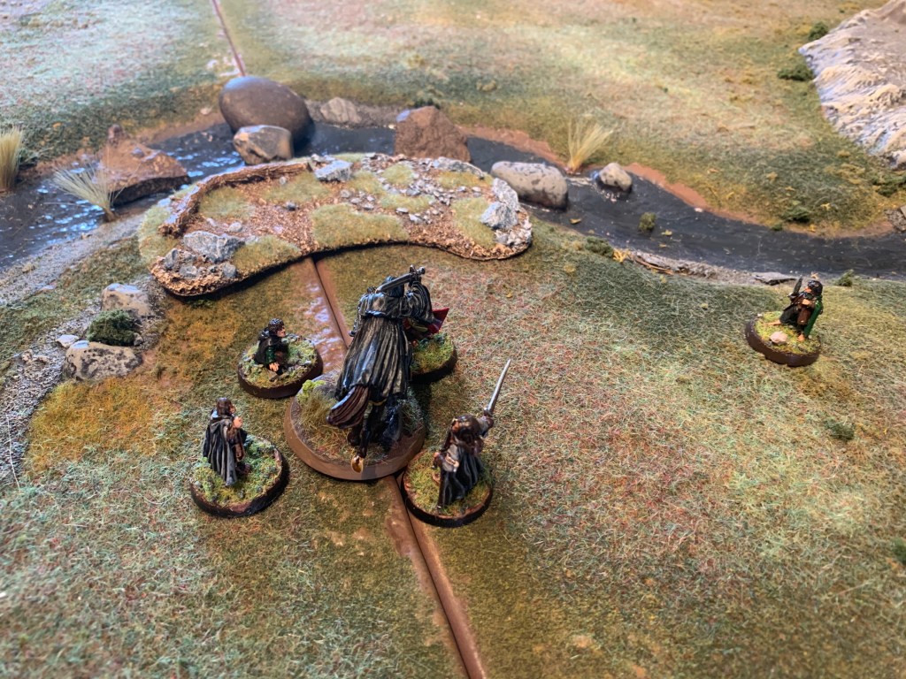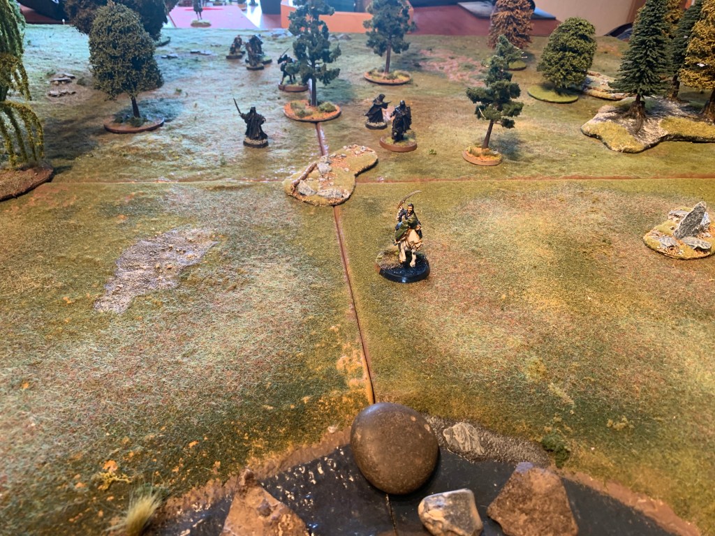 Good start with priority and Asfaloth races off and Aragorn and the Hobbits move swiftly around the Nazgul to assist but cannot charge the first turn.