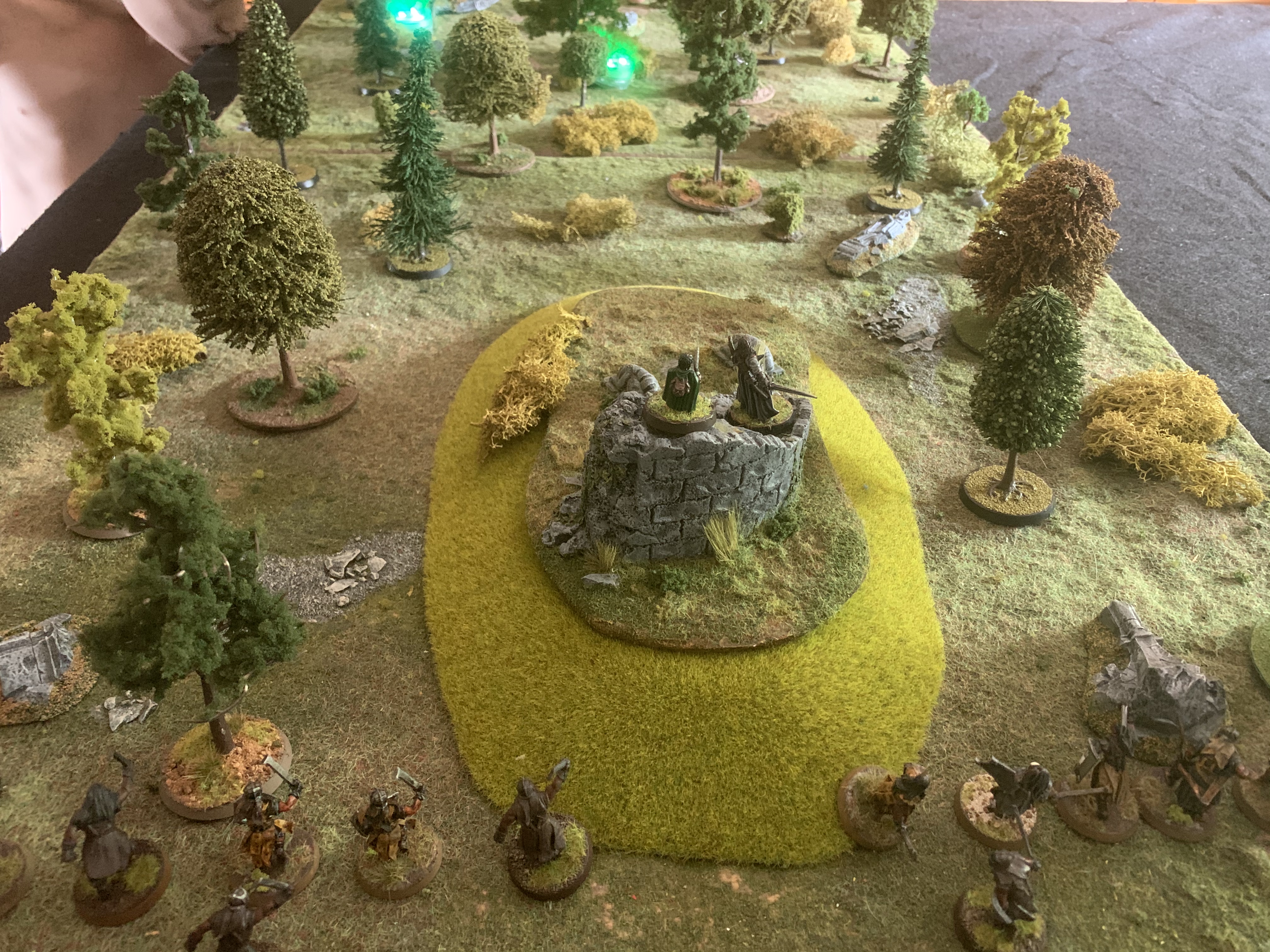 In this scenario Aragorn and Frodo need to escape from Lurtz and his scouts. The initial deployment is a little vague but actually quite important. Lurtz and crew start 3 inches in on the far side of the hill with Amon Hen. Aragorn and Frodo are said to be simply deployed touching Amon Hen. Probably the scenario writers had a nice big official model but I could not find anything, even a 3D print.
