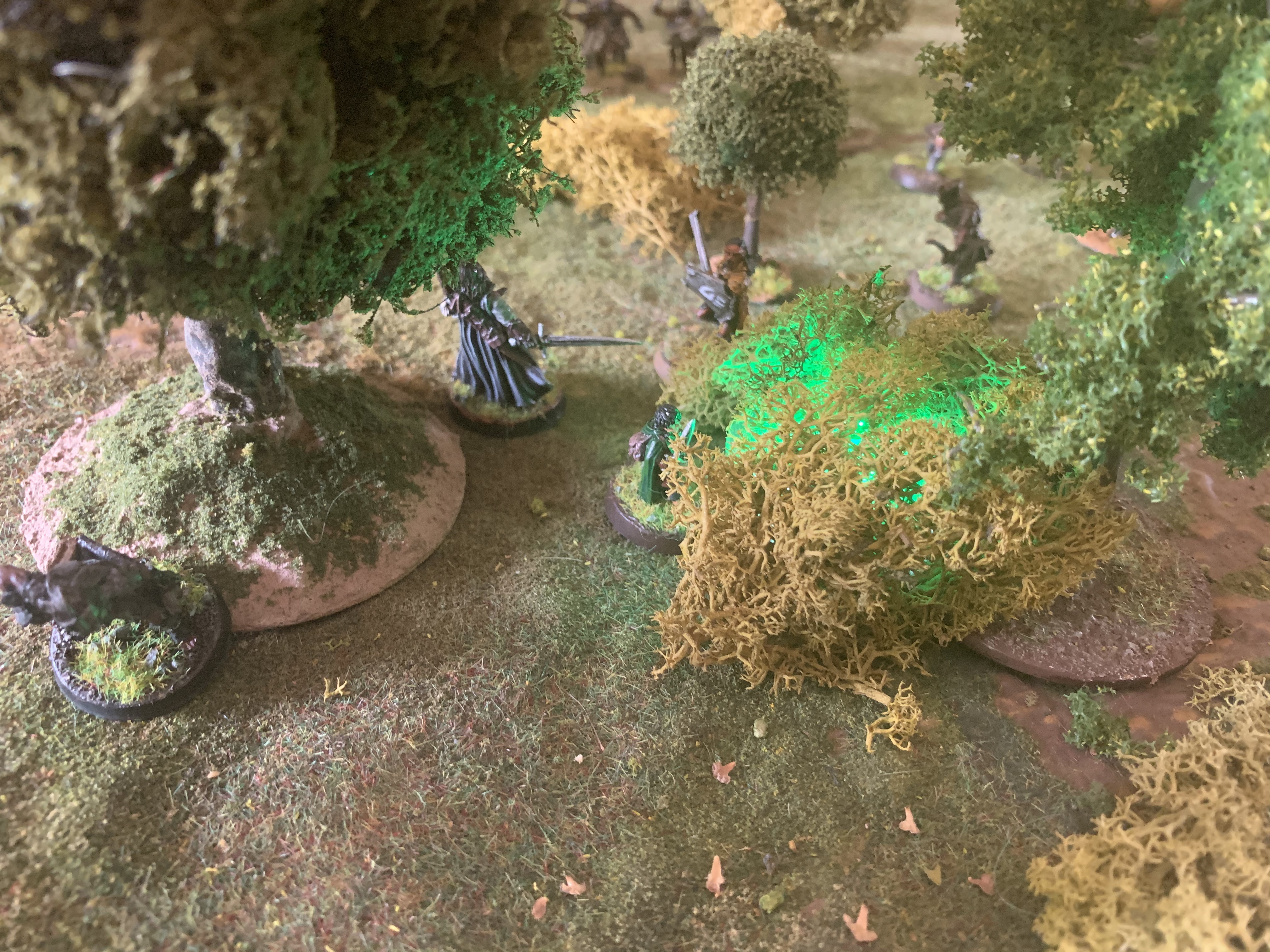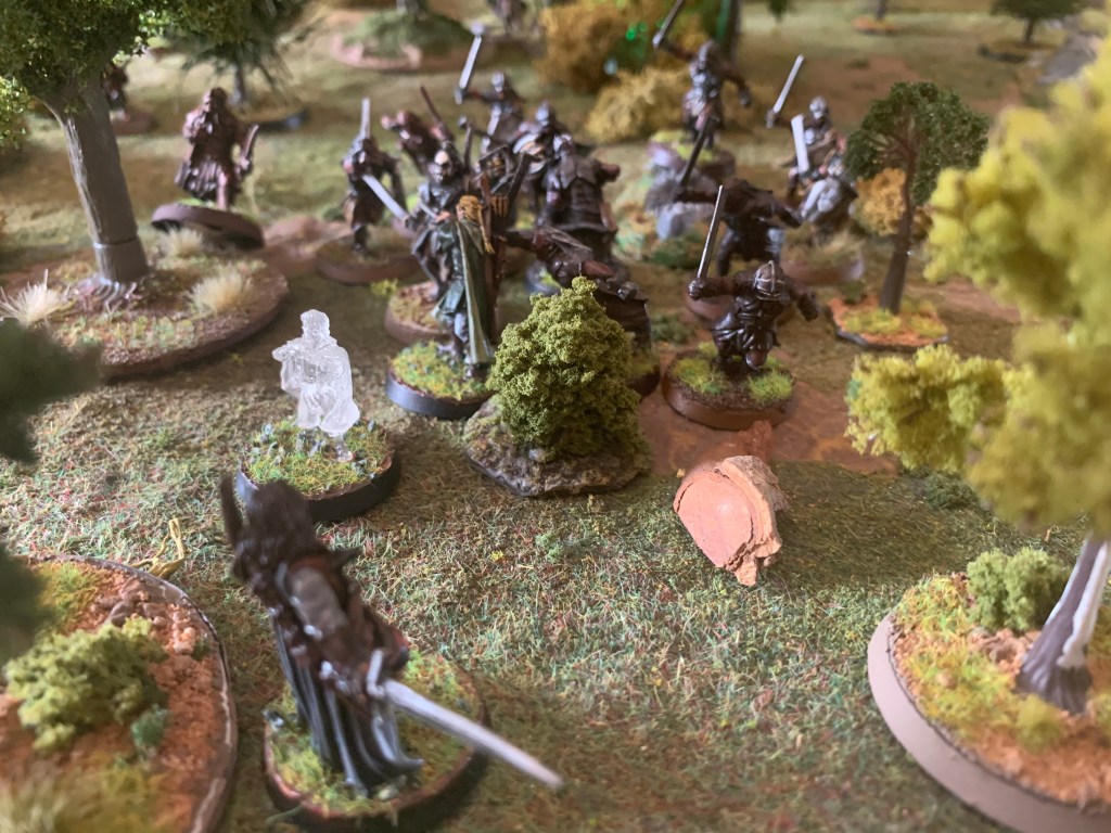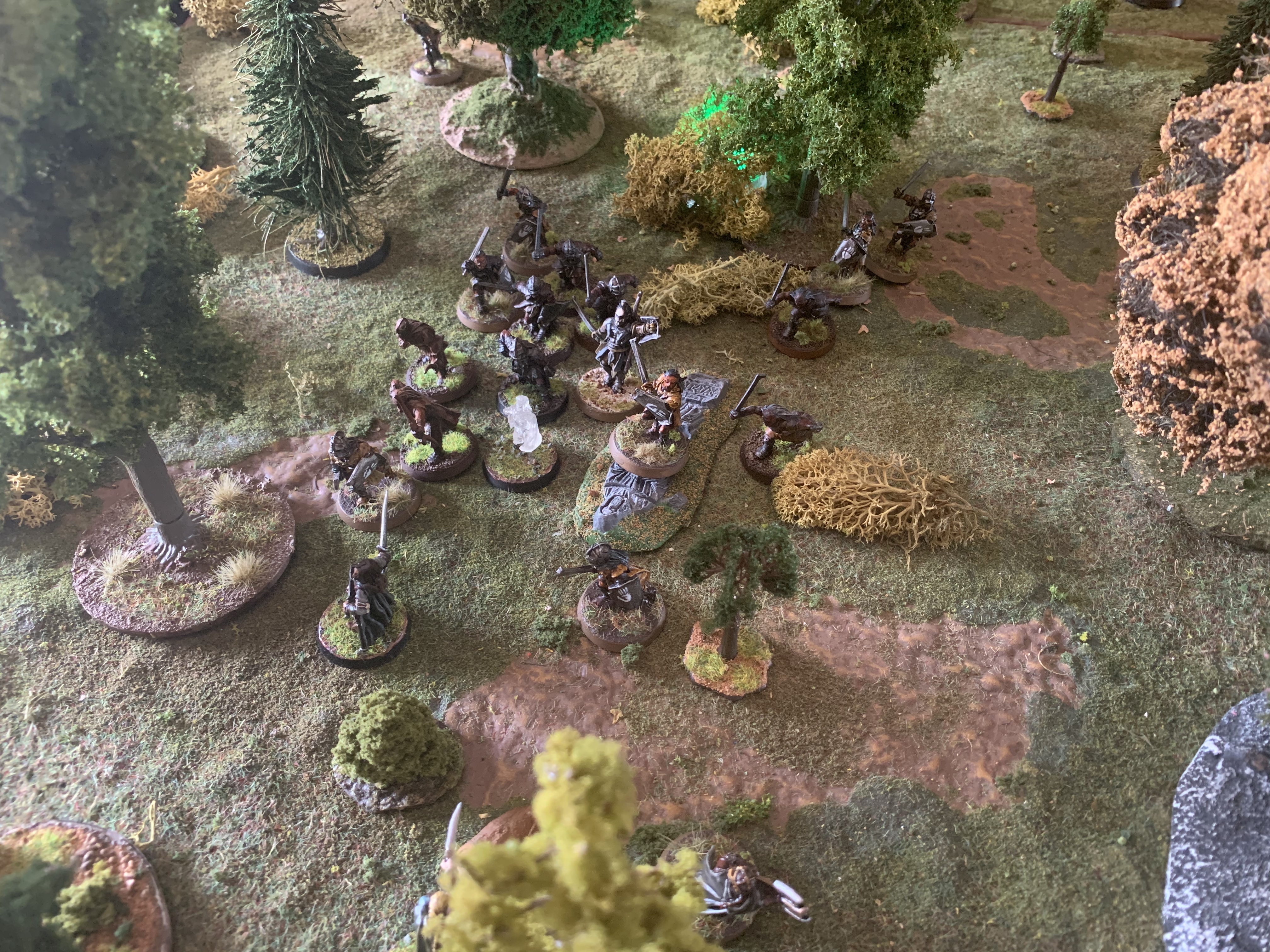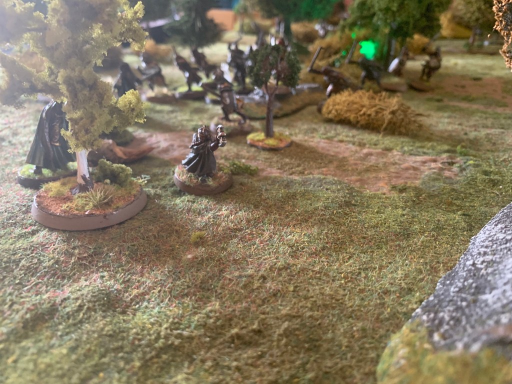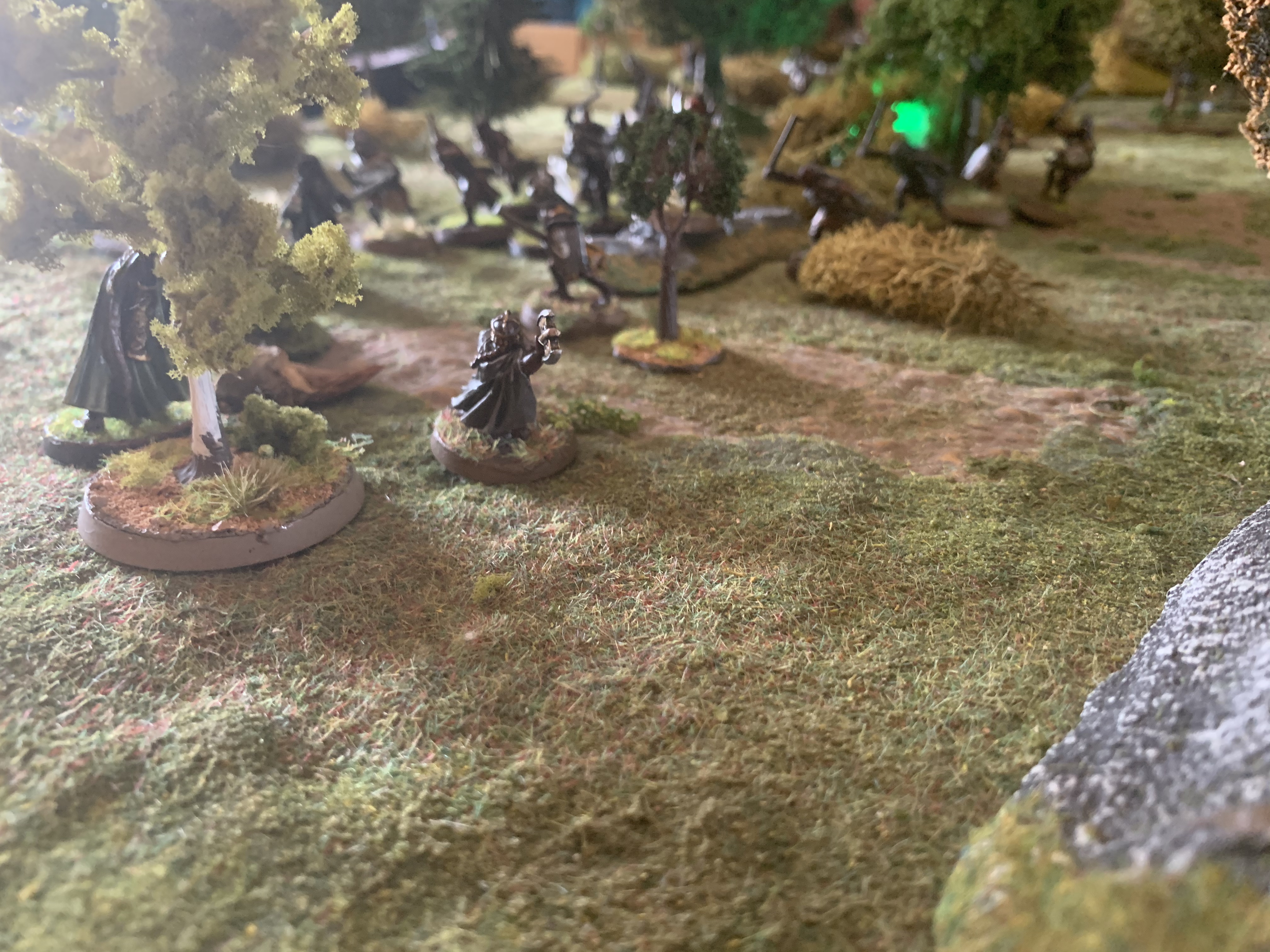 Though they did not arrive on the first turn with a six (turn 4) Gimli and Legolas soon roled a 5 and rushee to the rescue. Legolas fired deadly shots to take out two Scouts that came too close to Frodo. Aragorn fought his way through the captain in just one round and then rushed to safety whilst Gimli and Legolas blocked the way.