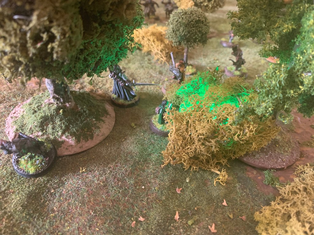 For the first few turns Good raced towards the exit. With scouts closing in from the side Aragorn held back to defend Frodo. Then Frodo had to put on the ring to escape further. Scouts failed to pass any courage tests to charge and even though he then rolled a one for the lure of the ring rule Frodo used his only 2 might points to continue his escape.