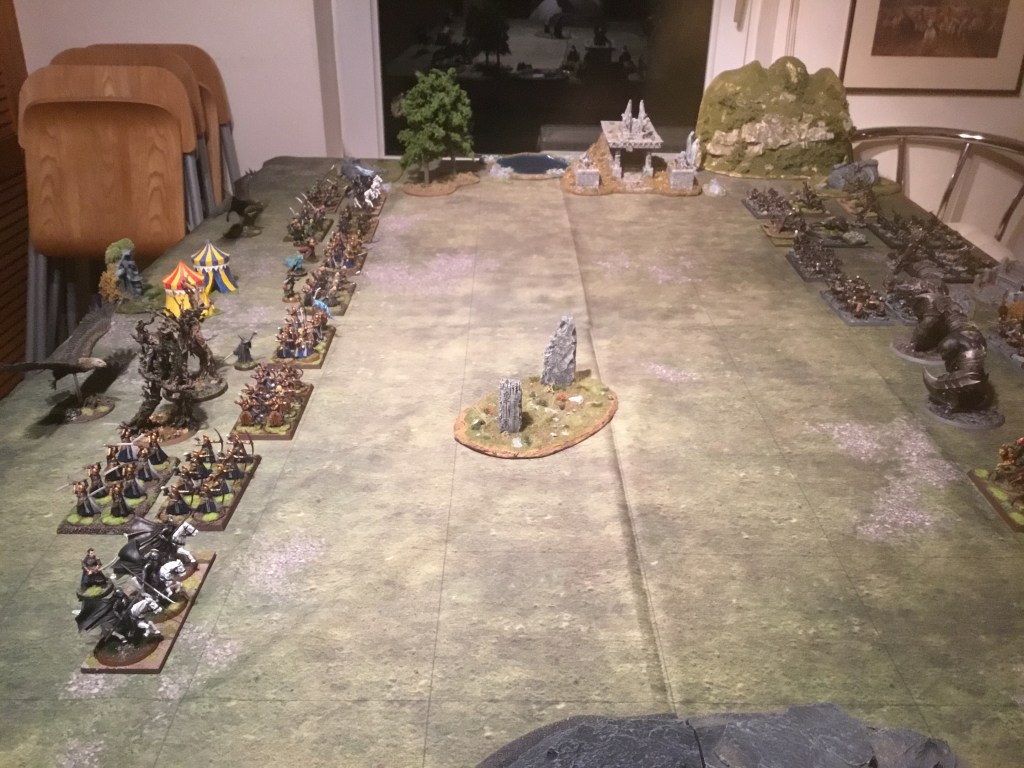 The mighty High Elven Lord has gathered his forces supported by two mighty wizards. Facing across the plain are the forces from Mordor led by the Khandish King, a mighty horde of orcs and goblins with two dark shamans.