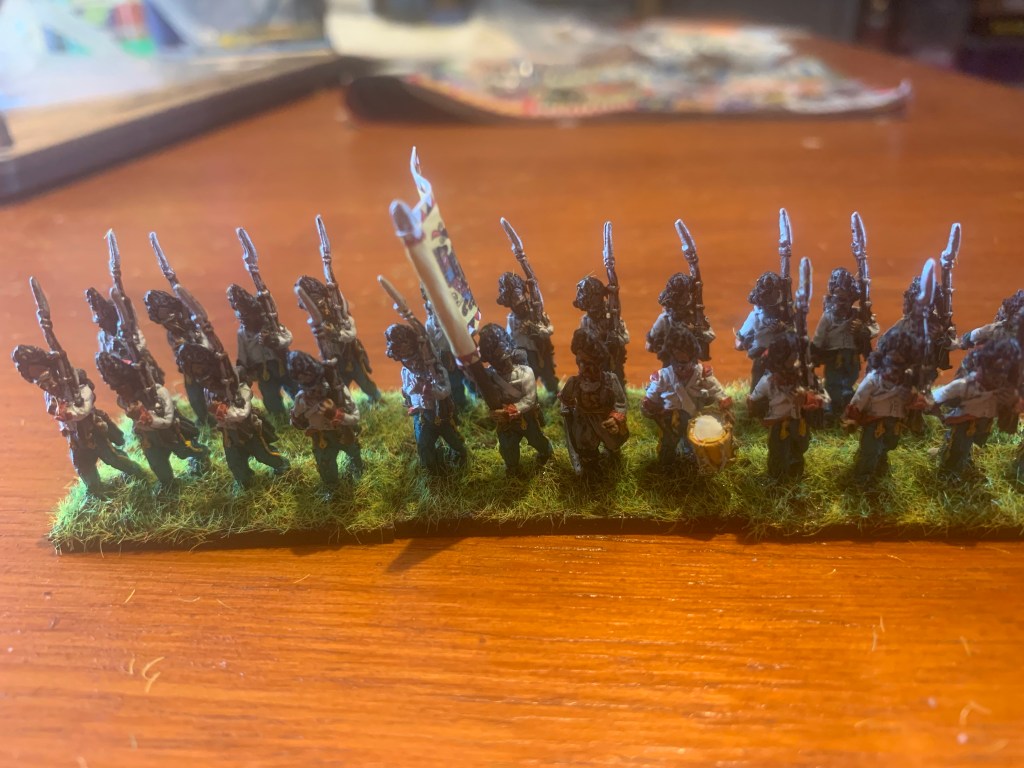Painted a group of Hungarian grenadiers . Paints were contrast colours highlighted where necessary with GW acrylics. This was the white and metal . Simple bases to match the other units . The flag is GMB and I added similar to my other units .