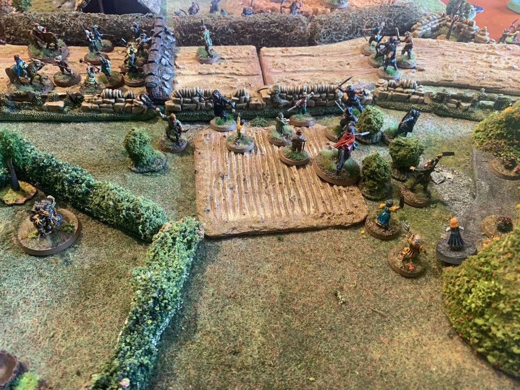 The Ruffians began with an attack across the barrier which fared badly. So they gave up on that and jumped over the hedges to either side, leaving it to their archers to pepper the barrier with ineffective archery for the rest of the game.