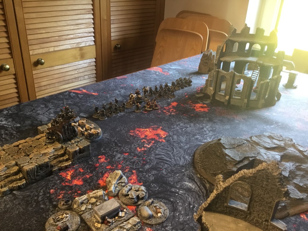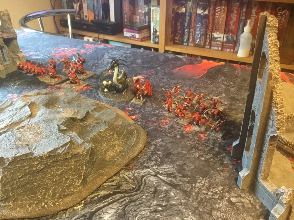 The dwarf lord in turn held back the demon lord and destroyed his hearth guard but was left isolated and exhausted! Victory was thus awarded to the Demons who forced the Dwarves back over the Lava river bridge in disarray.