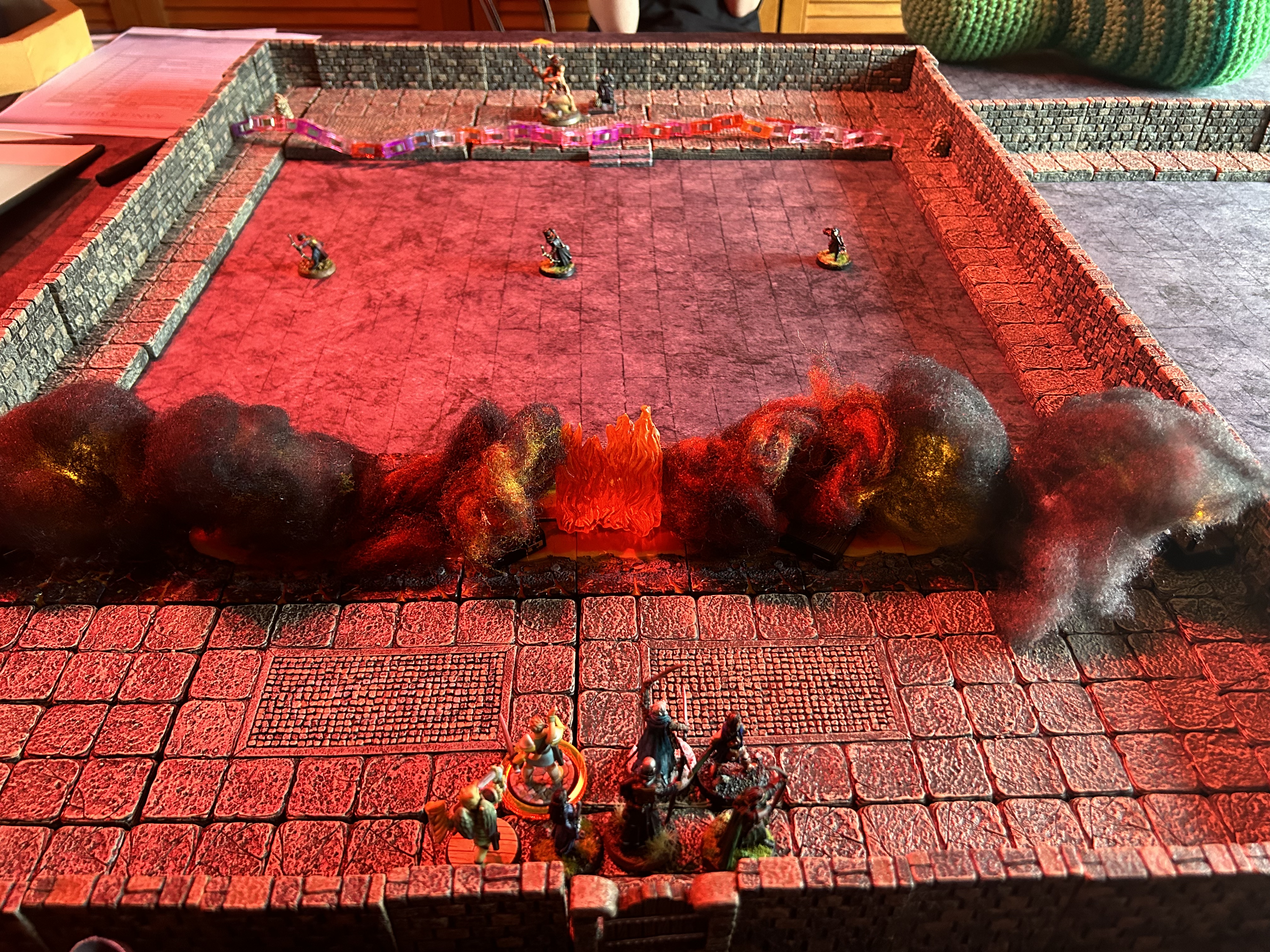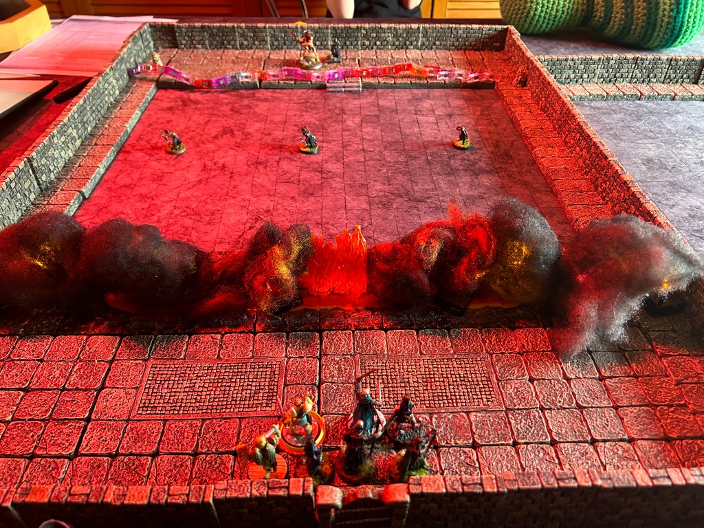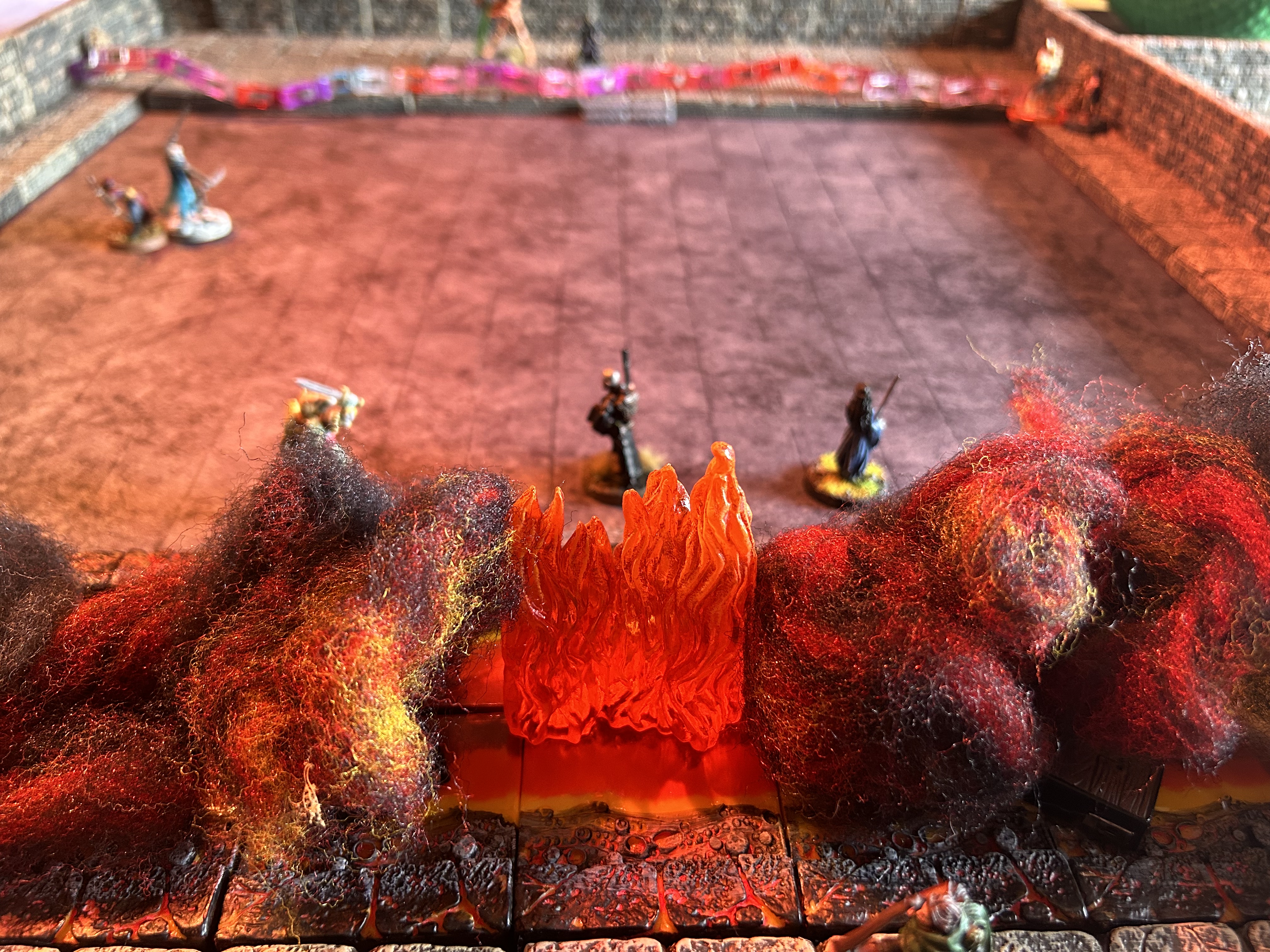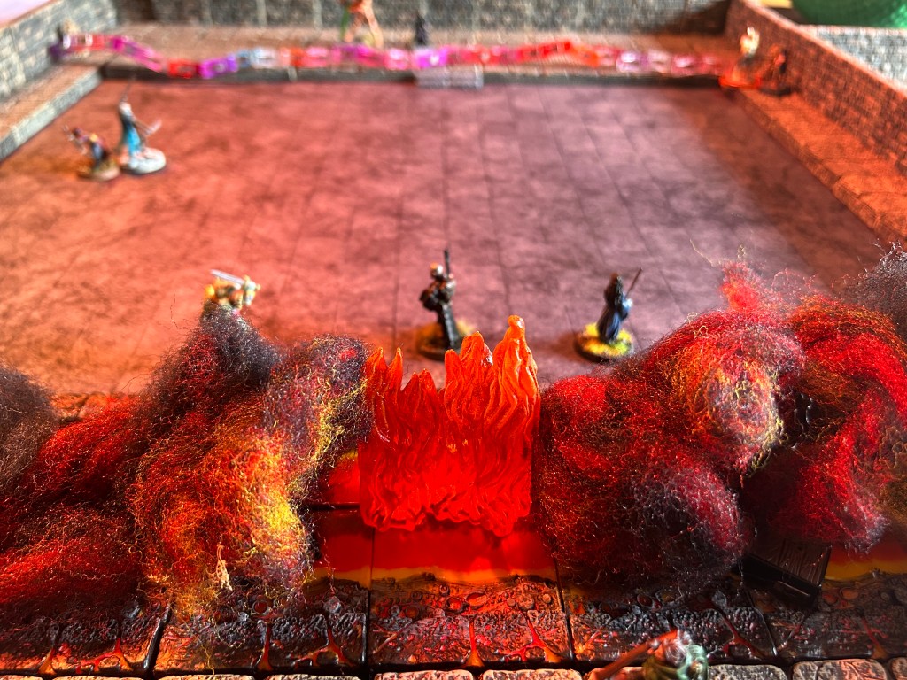 Our Heroes enter the final room only to find the villainous sorcerer protected by a wall of Fire and a magical chain net protecting him whilst he casts his dark spells.
