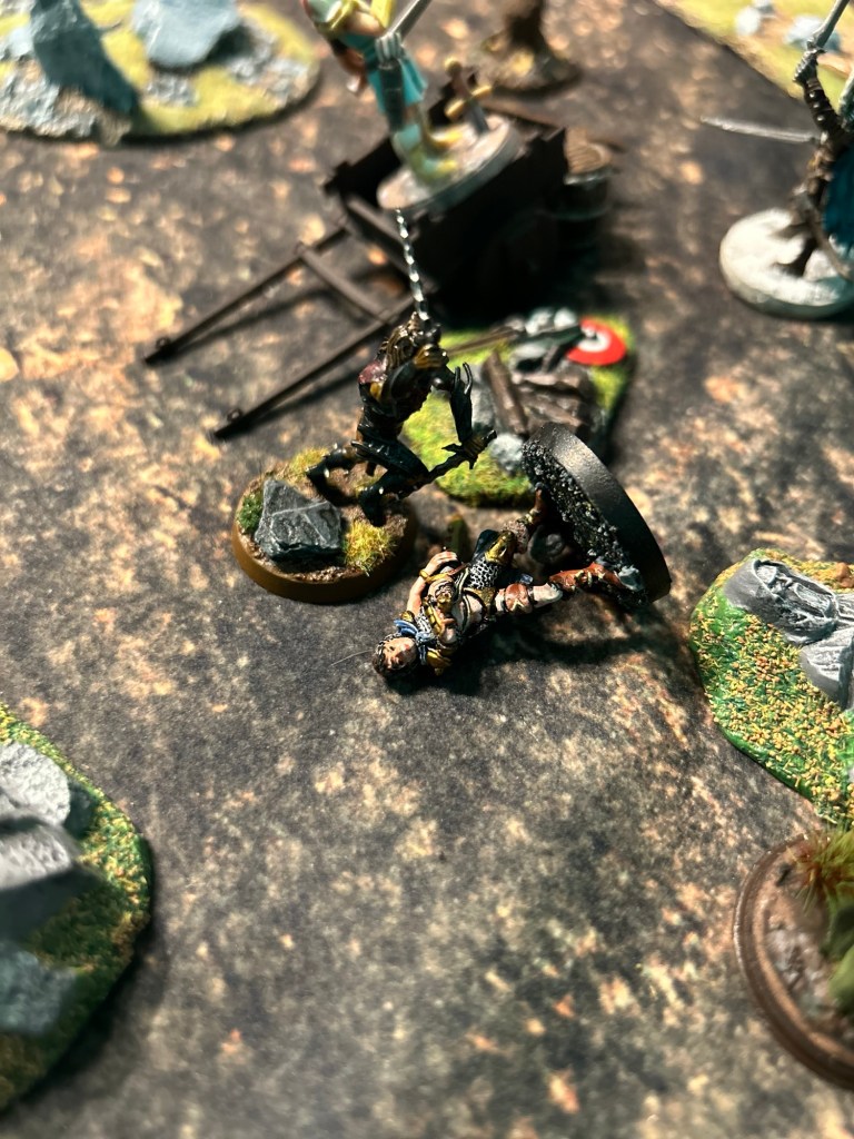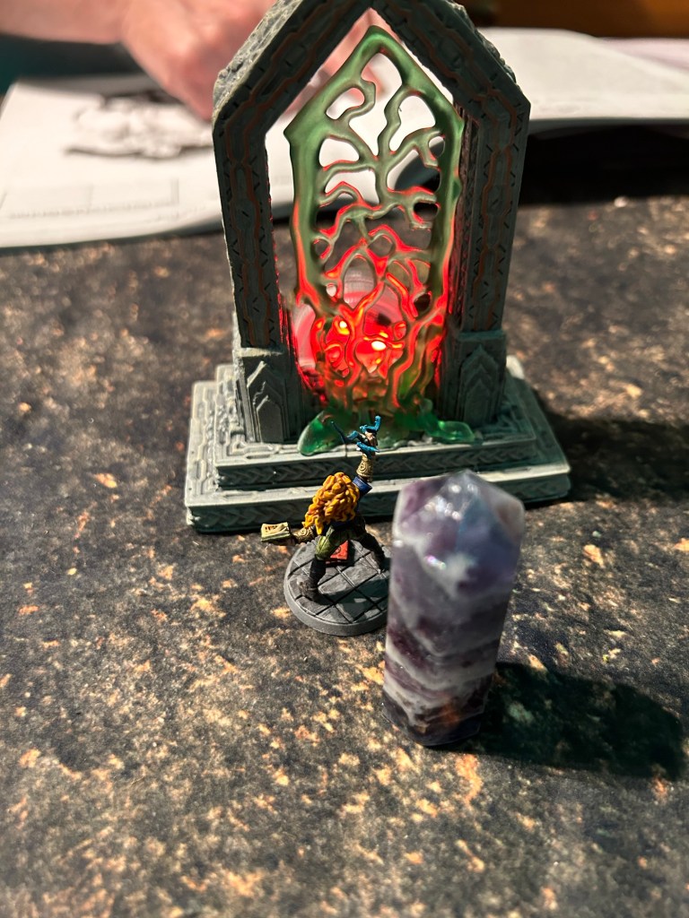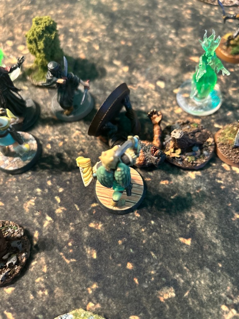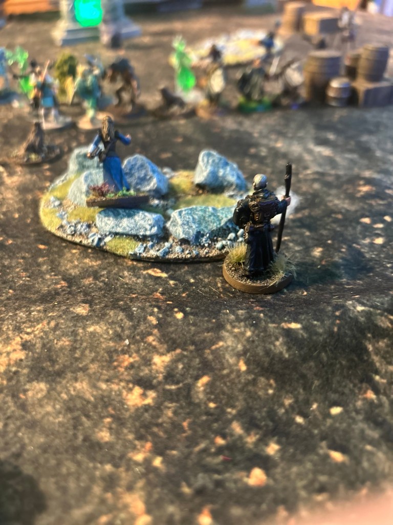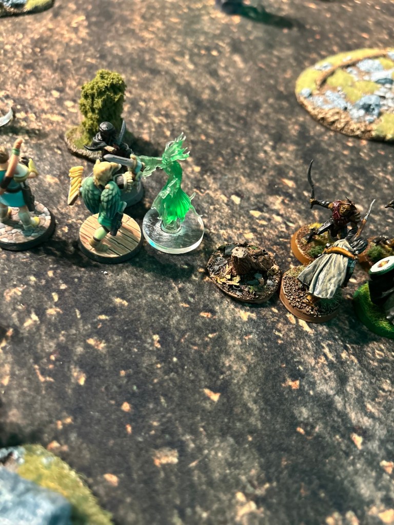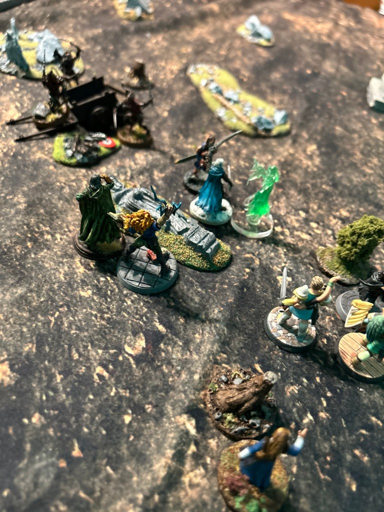 The final scenario in Ghost Stone for Rangers of Shadowdeep. Due to previous successes they were aided by three soldiers and the first event card would wait until turn 4. The distraction had proved useful. Link and Gwalchmai led the group tasked with guiding the sorcerer to the stone in order to destroy it with her powerful magic. They also had the scrolls and the stone ring from previous scenarios which they gave to the sorcerer tasked with destroying the stone.