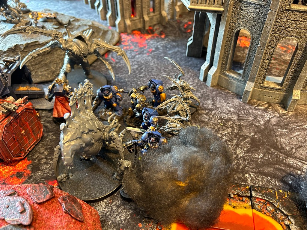 Used Link’s excellent space marines against his as yet unpainted but boosted Tyranids. All the marines are very nicely done now .
