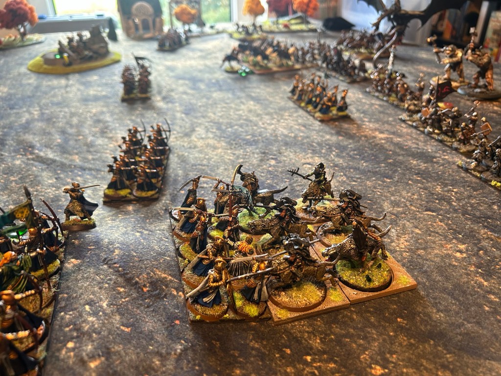Finally the Trolls struck the victorious elven cavalry who had pushed too far forward in the flank . Destroying them easily Elrond was forced to flee . However the orc warriors in the centre were smashed and the other warg riders were destroyed by the spearmen on the hill.