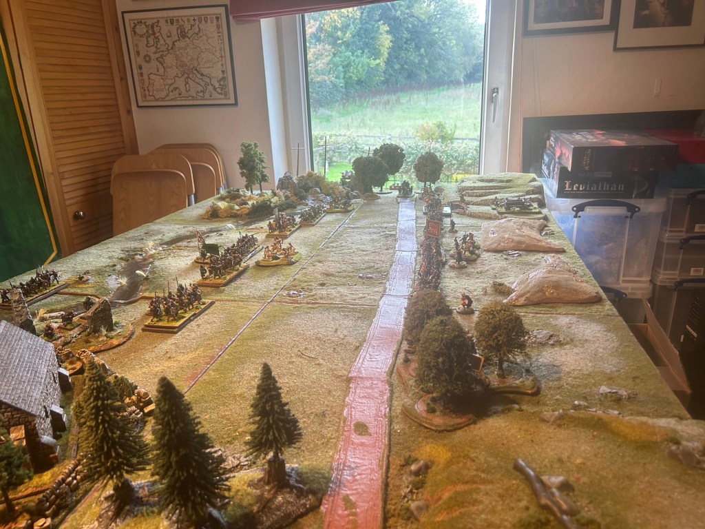 The figures are set out on the battle field as an example below . Looking from North to South. The Scots have charged across the Dullan water whilst Malcolm looks on from the Kirk his loyal Thegns in reserve . Meanwhile the Viking shield wall holds the high ground which is all the land east of the dirt road. To the south is the giants chair and to the north the famous Kirk with its standing stones.