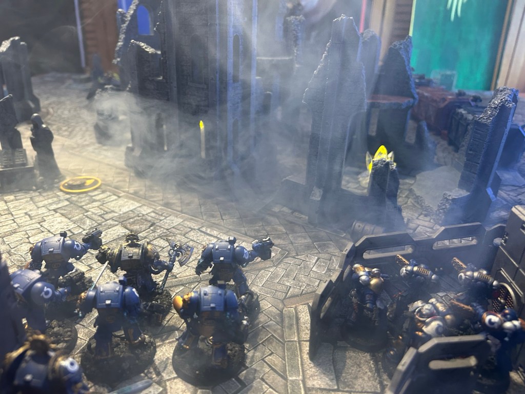 The space marines advanced into the ruins destroying the Necron melee units but take two losses from fire on the terminator squad.
