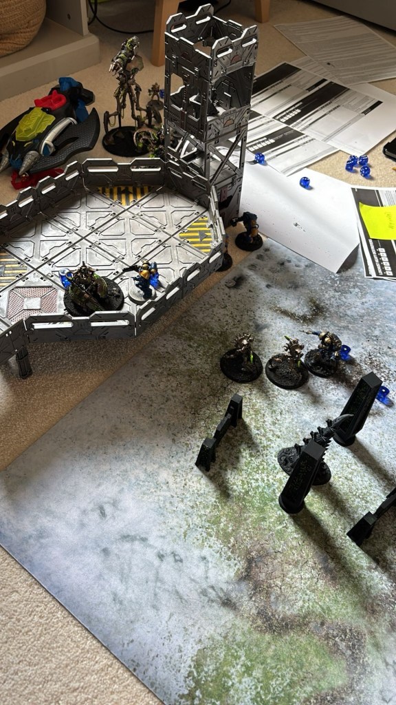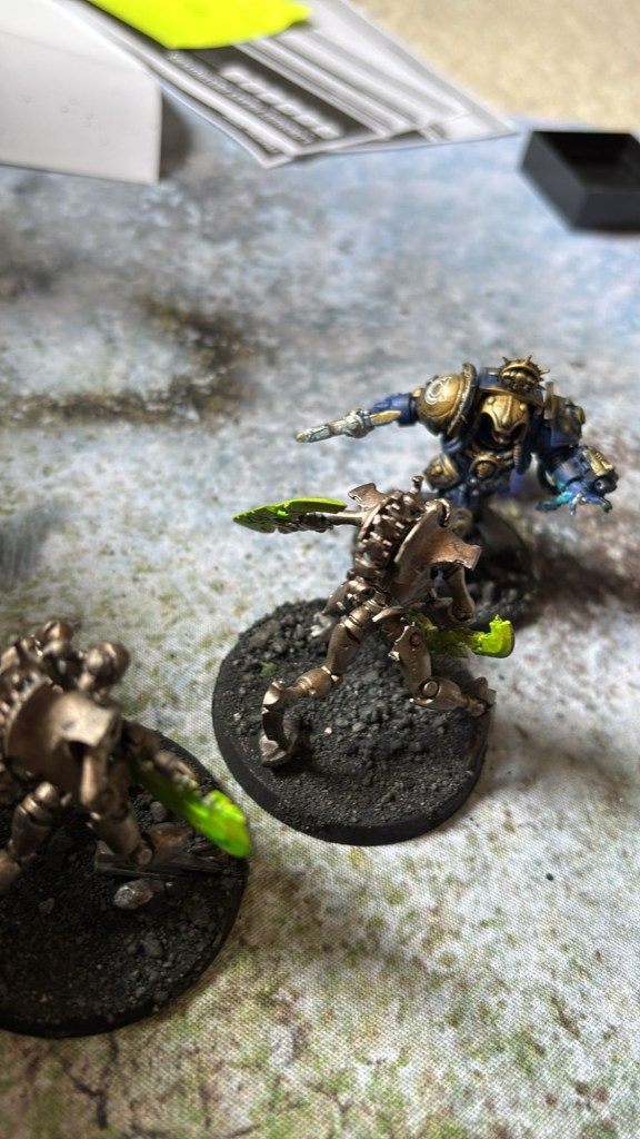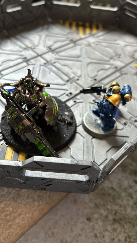 On a snowy planet the Necron warlord was trying to summon a dark god. The adeptus started intelligence caught wind of this. Thus, they sent a small 500 point army to stop this.The battle started with the Necrons. They had the skorpekh destroyers jump onto the point and defend it. They also positioned the canoptek Doomstalker as another line of defence. Three tomb blades charged at the space marines left flank but the infernus quad activated fire over watch and took out 2 tomb blades. The Necrons shot the infernus squad to pieces with the Doomstalker and lokhust heavy destroyer, leaving no survivors. All the other space marines were out of sight. Then it was the space marines turn. The terminators dashed from the right into the open, looking to charge the Doomstalker. The biker squad rolled over the bodies of the infernus squad to also charge the Doomstalker. The assault jump pack squad (ajps) charged the skorpekh destroyers after shooting ajps gained nothing from shooting but the biker squad achieved a wound on the Doomstalker. The terminator squad shot at an annoyingly placed scarab swarm which would’ve prevented their charge. It died. Ajps then charged the skorpekh destroyers dealing two mortal wounds, and knocking out two with their combined force. The biker squad charged and dealt another three wounds to the doom stalker with there astartes chain swords . The terminator squad, however failed the charge and were left out in the open. the left tenant in Phobos armor failed his charge roll, meaning he could not finish off the tomb blade. It was then the Necron turn. The remaining tomb blade moved forward to make his charge real easier, but apart from that there was no other movement.