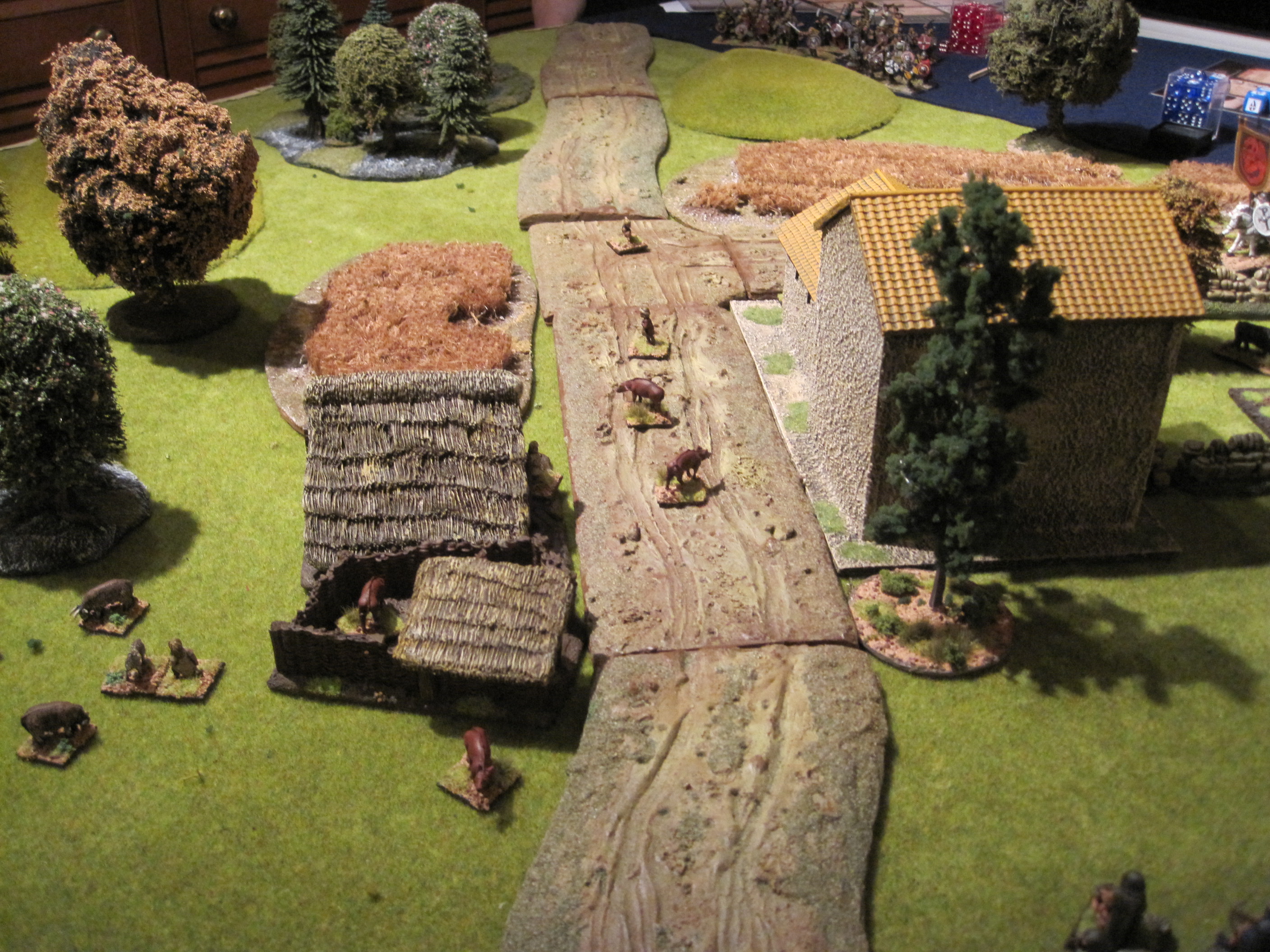 The Romano-British Hearthguard advanced rapidly from the NW towards the Angles (SW) and pinned them down as they marched onto the board. The Welsh entered from the NE and advanced towards the village along the road and sent some javelinmen towards the eastern woods. The Saxons deployed from the S in a long line.
