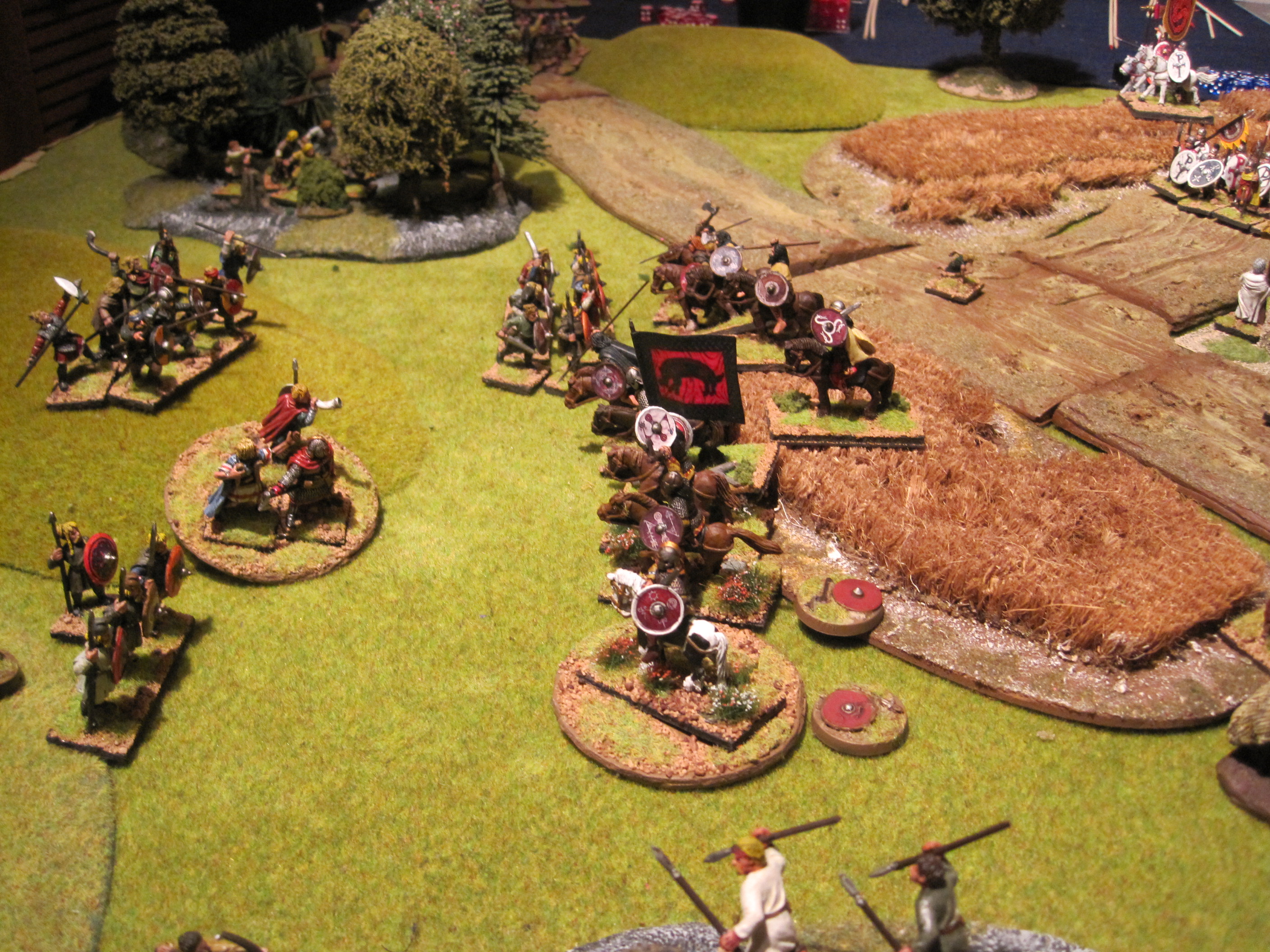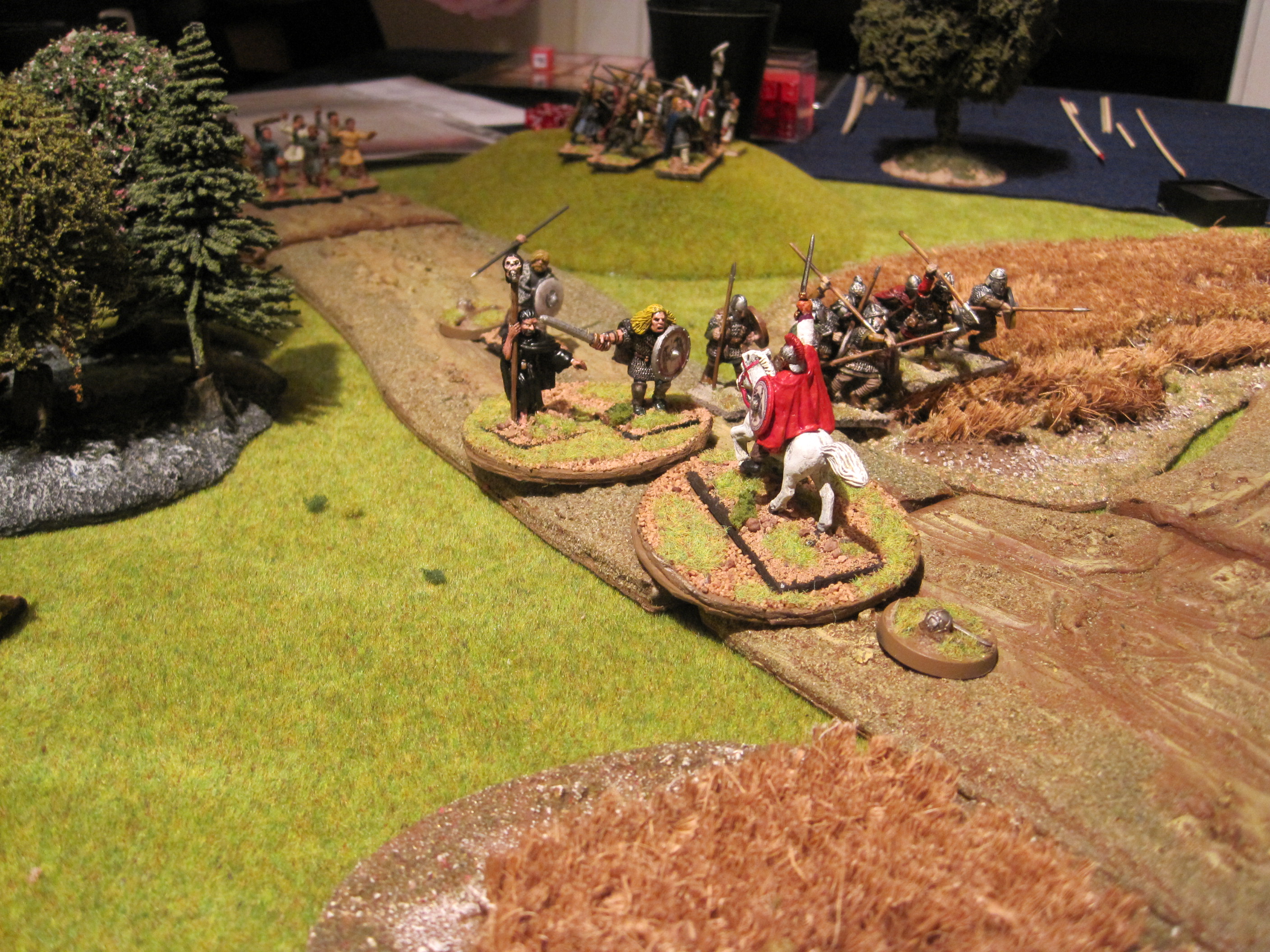 The Welsh cavalry charged the Saxon warriors led by the mighty Hwyll. Thinking to destroy their foes utterly with a stunning charge they were disappointed to find them hard to kill. The Saxons retreated leaving the Welsh caught in disarray in the open, fatigued. The supporting Welsh warriors retreated when threatened leaving their cousins to be charged by Saxon warriors whilst Hwyll looked on ineffectively and Raedwald skulked behind his Hearthguard away on the hill to the SE watching events unfold. The Welsh Hearthguard were slain to a man and Hwyll was forced to retire, fatigued, lucky to escape with his life.