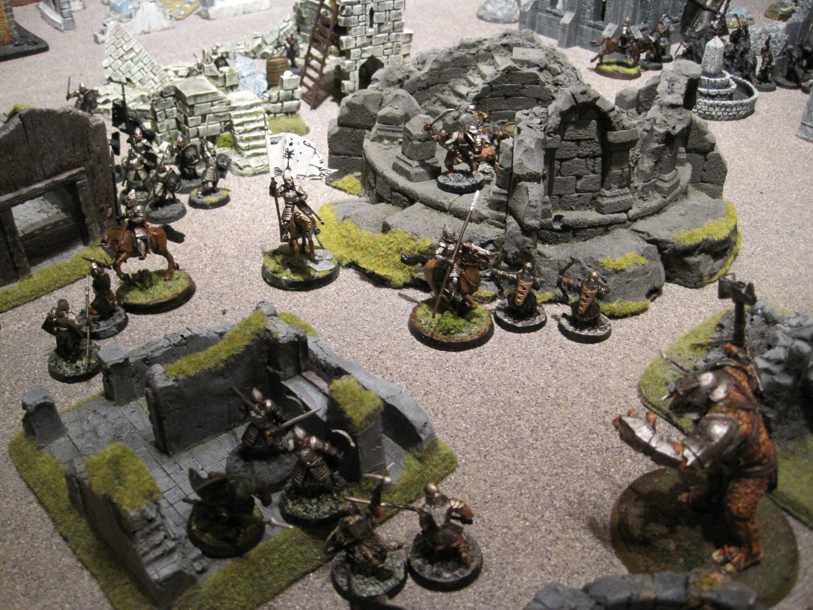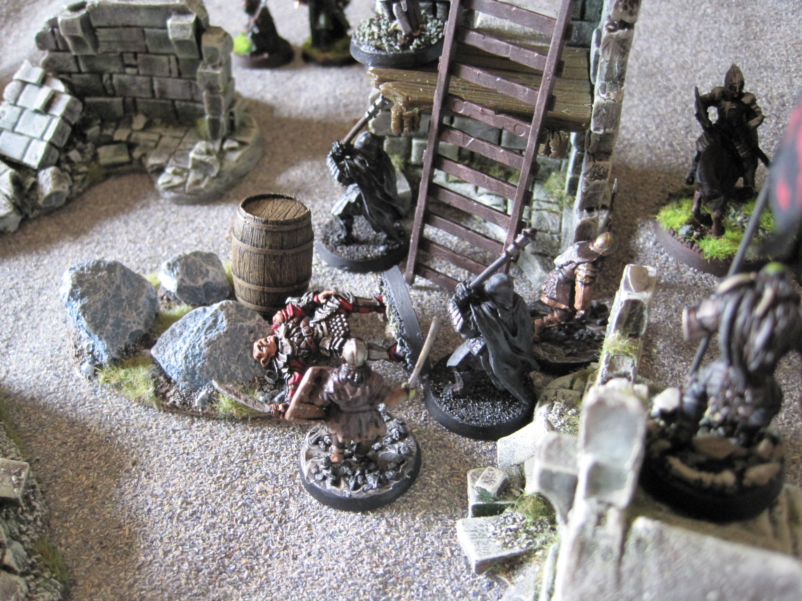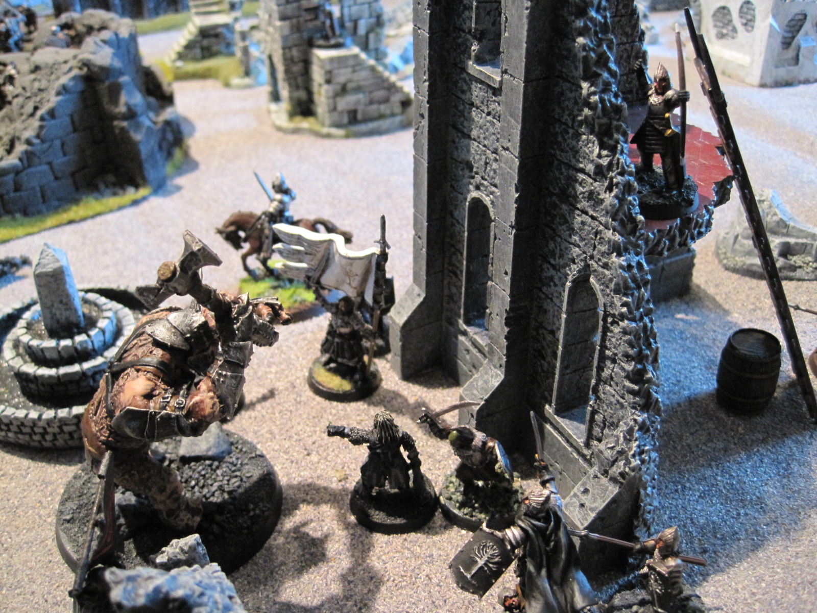 Gothmog’s arrival on the western flank was decisive. The cavalry were pulled from their mounts and the Troll carved a bloody path through the infantry who dived into the cover of the buildings. With a group of orcs in control of the round tower objective Gothmog advanced rapidly towards the second whilst his infantry cleared their own way in support and held off just two Gondor warriors in the round tower (the latter forced to using shielding in the hope that reinforcements would arrive before the Troll did). The Gondor Captain was isolated, inneffective and trapped in a seperate ruin locked in a deadly duel with the Orc Captain.