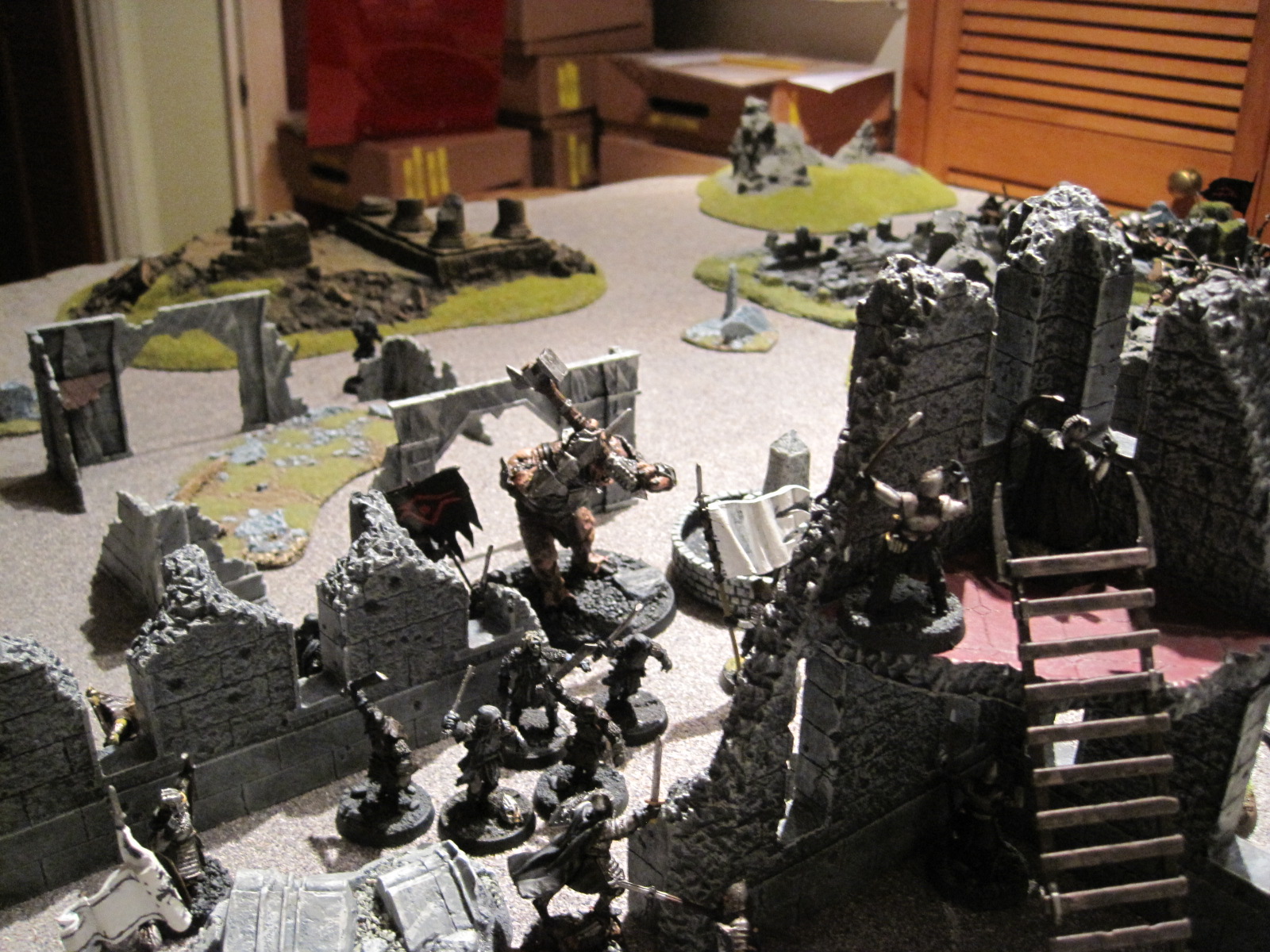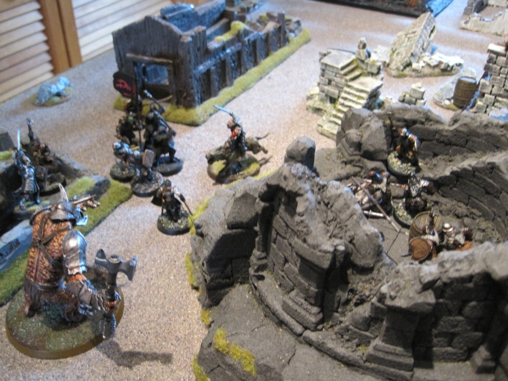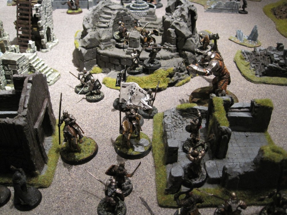 Gothmog’s arrival on the western flank was decisive. The cavalry were pulled from their mounts and the Troll carved a bloody path through the infantry who dived into the cover of the buildings. With a group of orcs in control of the round tower objective Gothmog advanced rapidly towards the second whilst his infantry cleared their own way in support and held off just two Gondor warriors in the round tower (the latter forced to using shielding in the hope that reinforcements would arrive before the Troll did). The Gondor Captain was isolated, inneffective and trapped in a seperate ruin locked in a deadly duel with the Orc Captain.