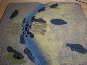 The Ziterdes boards are basically blank sculptured plastic coloured brown with some texture and features added like hills, rivers or a marsh. There are a good few options so I started with 10. They come with clips to hold them together during battle that work quite we I purchased a Citadel Scenery Painting Pack (contains lots of flock) and a Woodland Scenics Landscape Learning Kit as well as lots of PVA Glue and set to work.