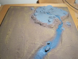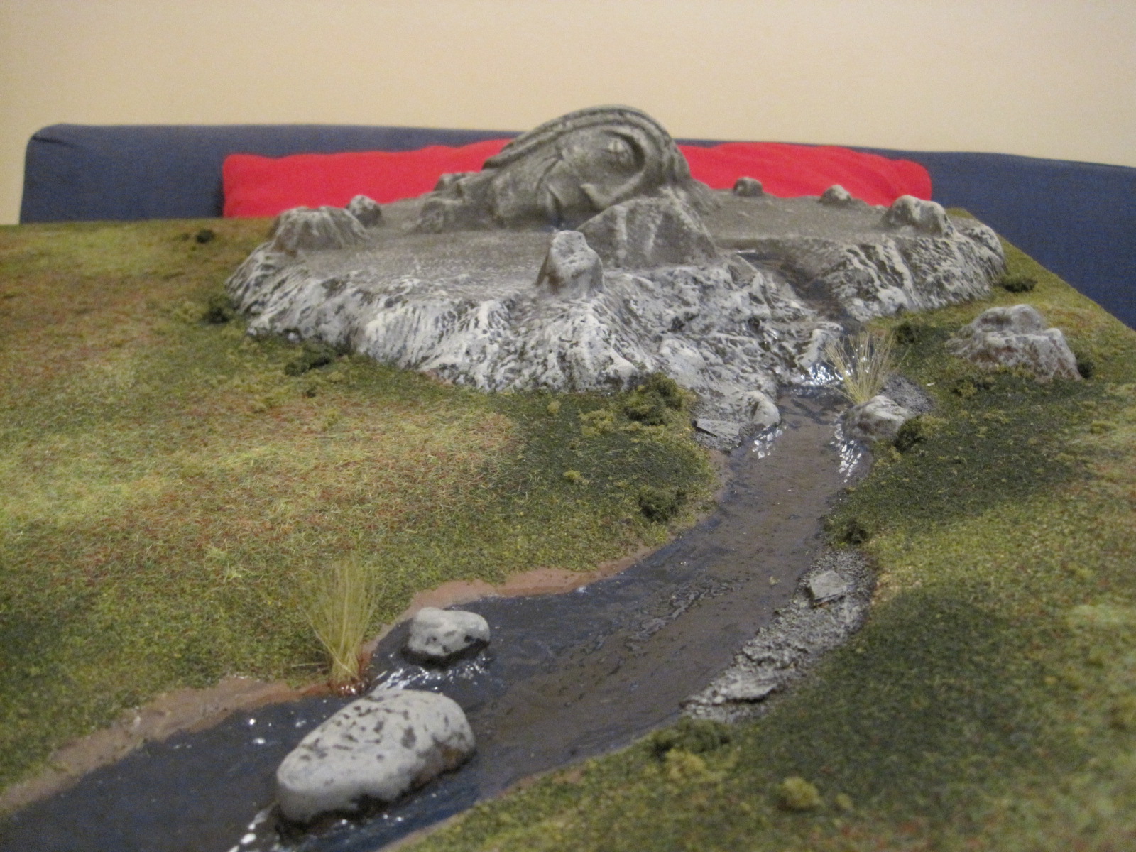 The final pieces to complete where the river and mystical Hill of the Spring. These were completed in the same way as above with sand and slate being added to river banks to give texture and then painted grey. Next the water was painted using a mix of blue, green, brown and black artists acrylics blended together to create the illusion of depth. A sort of Prussian Blue with a darker centre. This was then painted with Realistic Water effect once dry (folllowing the instructions on the Woodland Scenics video from their website) and then allowed to dry. You have to do the water last to avoid getting flock in your water so it is a bit daunting. I experimented with Water Effects and White Paint on the waterfall but that was not so good on the first try so I had to start over.