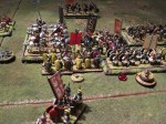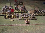 Horsa thus retired his companions towards his own line leaving his Nobles and warriors to his right slightly isolated in the path of the Roman cavalry. Had he held his ground though he would have found himself facing the entire roman infantry alone. His slingers took out the mounted skirmishers: another LP lost! The Roman cavalry charged supported by their infantry. The infantry main force led by the Nobles charged against Horsa. This of course put them now within charge reach of the rest of the Saxon warriors who had yet again failed to advance in support of their King.