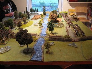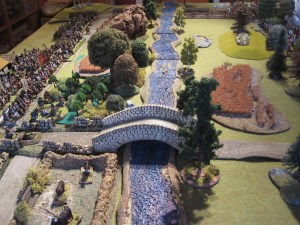 Running west to east in the centre of the battlefield is a shallow river. Again this counts as rough ground except at the two fords and the bridge where a single formed unit can cross without restriction. There is another irrigated field across the river opposite the Mill. To the far west of the map is a walled field bordering the river bank. The southern wall counts as a linear obstacle and as cover.