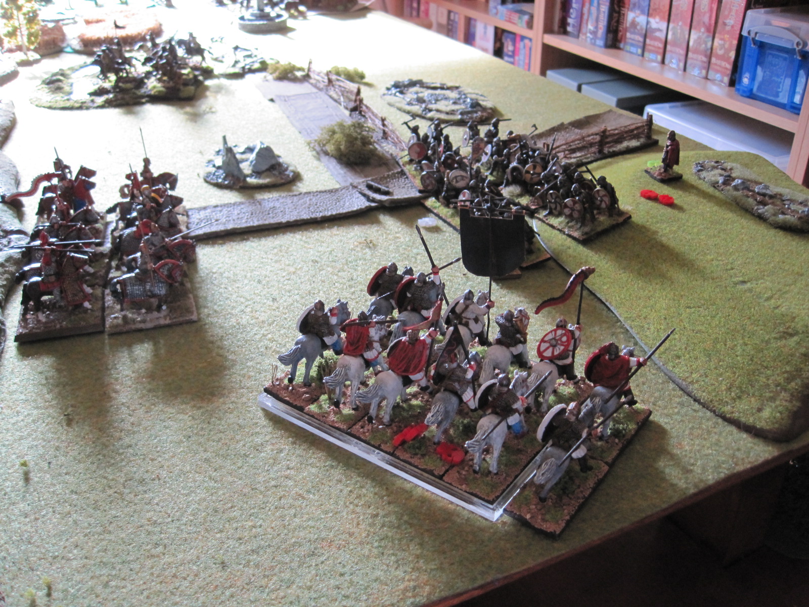 Under pressure from the cataphracts and the British cavalry, the two unsupported flanks of the shieldwall broke and were destroyed. Leaving only Hengest and his Saxons in the centre. Hengest was wounded in the fight but did manage to drive off the cataphracts and light cavalry opposing. To the west and east however the Roman cavalry swept past thundering into the unsupported Frankish cavalry led by the Prince to the far Eastern edge and into the retreating Saxon shieldwall. The Frankish cavalry were unable to defeat the victorious Britons. In the ensuing melee the Frankish Prince Arnulf slew Riothamus in personal combat. However he found himself surrounded and was captured by the British cavalry. His own men fled the field after just one round of combat despite being fresh whereas the British had sustained many losses against the Saxon infantry. In the centre the Barbarian cavalry were also destroyed by the Roman infantry being unable to make headway against the Roman Long spears advancing in numbers, supported by archers.